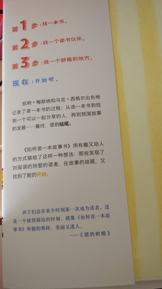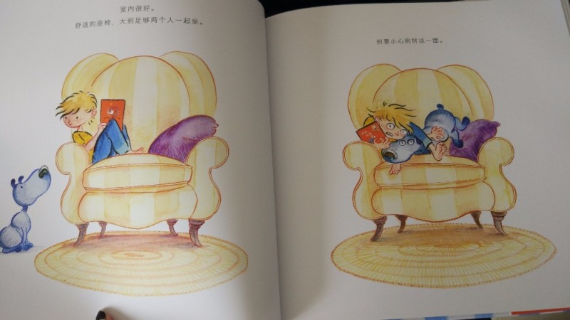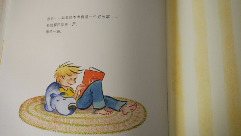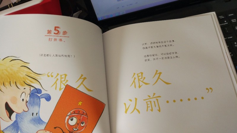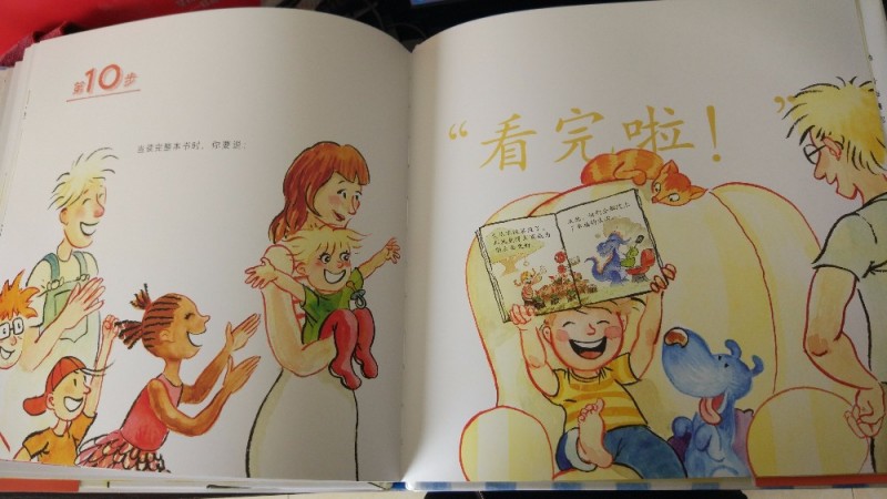 整本书很有逻辑,对读书做了详细的分步。第1步:找一本书;第2步:找一个读书小伙伴;第3步:找一个舒服的地方;第4步:看书的封面;第5步:打开书;第6步:当故事中的角色说话时,不管说什么。。。。。。要用符合角色身份的声音读出来;第7部:不管你读什么,都要把书拿起来,让你的伙伴能看到图。当他们看不清时,就会不耐烦:第8步:如果看到你不认识的字,试着拼读出来或者看看图找找线索;第9步,当你读到故事里令人兴奋的部分,也要让你的声音听起来很兴奋;第十步:当读完整本书时,你要说:“看完啦!”“然后。。。。。。如果这本书真是一个好故事。。。。。。那就翻回到第一页,再读一遍。”
