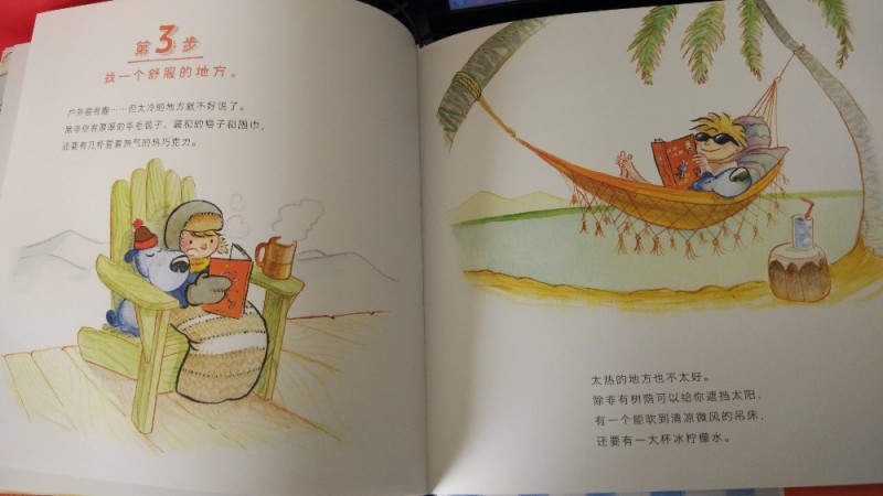 第三部分着重写阅读地方,让我回忆起小时候的自己。小时候自己就是喜欢在室外写作业画画,但是天黑了也不挪地方,直到作业写完或者作品结束。所以,很小就近视眼了。书中很幽默的告诉宝宝们读书的好地方和舒服健康的读书习惯。“户外很有趣。。。。。。。但太冷的地方就不好说了除非你有厚厚的羊毛毯子,暖和的帽子和围巾,还要有几杯冒着热气的热巧克力。”“太热的地方也不太好。除非有树荫可以给你遮挡太阳,有一个能吹到清凉微风的吊床,还要有一大杯冰柠檬水。”我的坏习惯,如果是这样的:“太黑的地方不好,除非你有灯光柔和的台灯。”