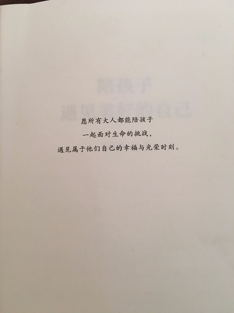 收到这本书很开心,包装得很好,有塑胶封,有股书的清香。《陪孩子遇见美好的自己》,喜欢这个书名,陪孩子遇见美好的自己,送上扉页的一句话,愿所有大人都能陪孩子一起面对生命的挑战,遇见属于他们自己的幸福与光荣时刻。