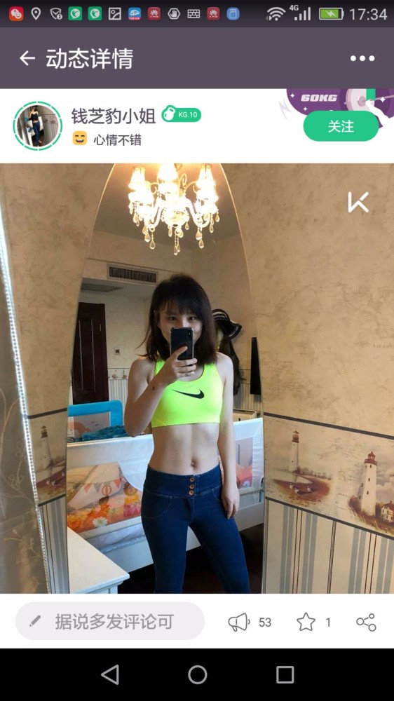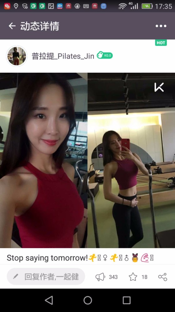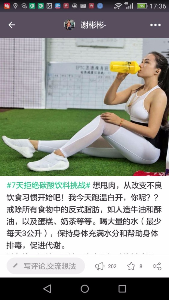 冬天容易长膘,长了多余的肉,再减回去就很难了,节食我可做不到,一顿不吃都不行,还是多出汗运动,让脂肪燃烧起来吧。有减肥想法的朋友一定注意,运动强度要让心率达到130——140之间,持续四十分钟以上才有效果,还不能三天打鱼,两天晒网,坚持下去,即使减肥效果啊不明显,但是起码养成了运动的好习惯。我的群里那些爱美的女生,为了光鲜亮丽的外表,为了马甲线,为了增肌减脂,真的是很拼的。一言不合就进入健身房举铁,撸铁,瑜伽、普拉提,平板支撑、倒立……今天发几张让大家看看。相信一分耕耘一分收获,相信坚持的力量,改变是量变以后的结果。 ![]() ![]() ![]() ![]() ![]() ![]() ![]() ![]()