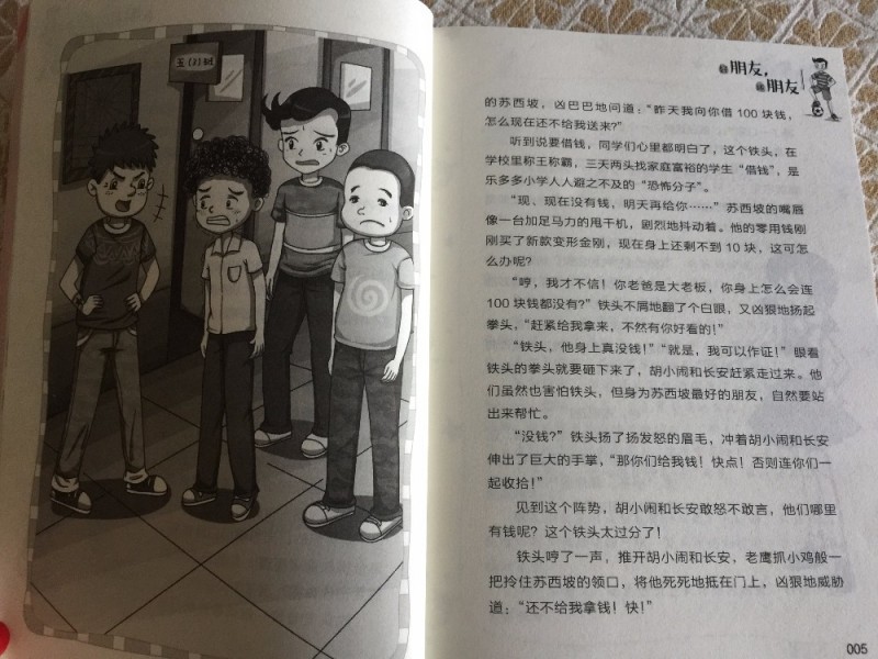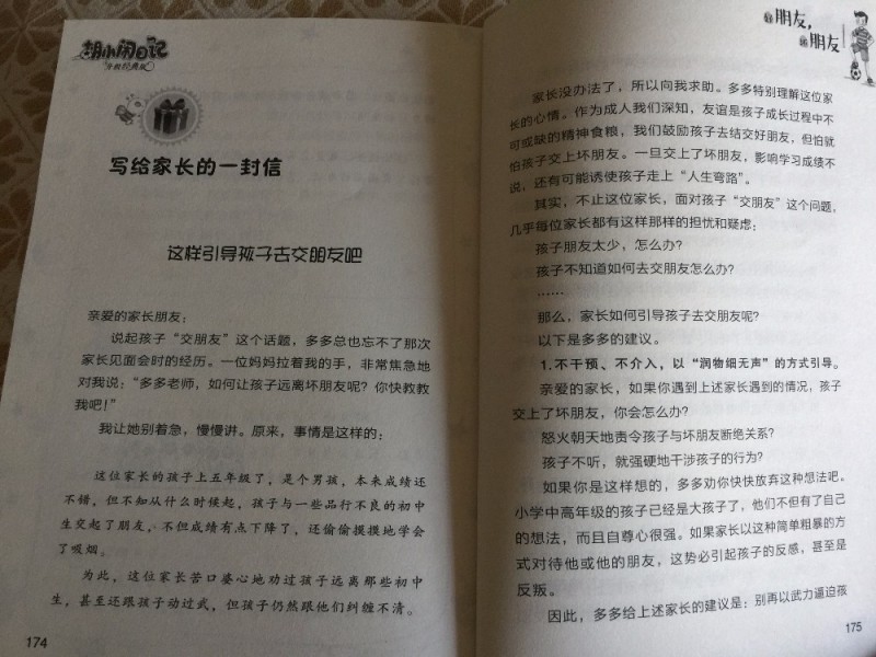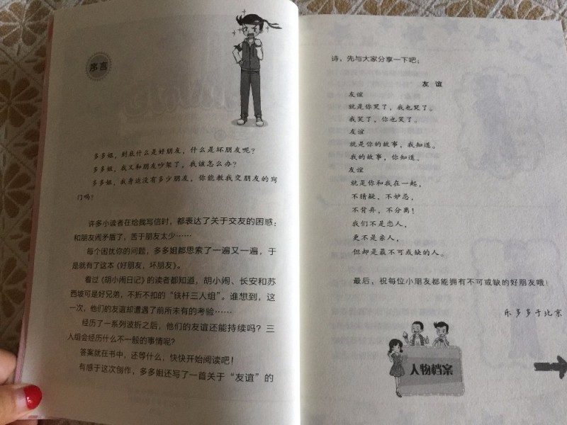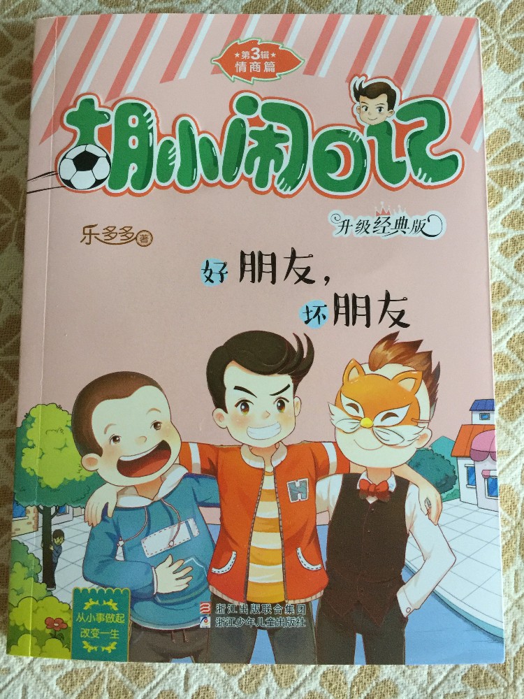 ![]() 首先非常感谢地带和浙江少年儿童出版社给予的这次试读的机会! 《胡小闹日记》是著名儿童文学作家乐多多的经典作品,这套书主要是针对情商培养的,共有6册,每一册都针对一个情商问题,给孩子讲述了一个有趣动人的校园故事。对于上小学的孩子们来说,这一类的故事书都是他们非常喜欢的。因此孩子拿到书,就喜滋滋的沉浸在故事中了。下面我们一起来看看这个故事吧! ![]() 这是一个关于朋友的故事。我们从小到大,会遇到不少的人,那么哪些人可以和我们成为朋友?到底什么是好朋友?什么是坏朋友呢?相信在成长的道路上,这个问题大家都遇到过的。有些朋友可以两肋插刀,有些朋友却会出卖自己,有些朋友锦上添花,有些朋友雪中送炭,我们如何才能练就一幅火眼金睛,找到真正适合自己的好朋友呢?在胡小闹的日记中,寻找一下答案吧! ![]() 胡小闹、苏西坡、长安,他们三人组成了一个“铁杆三人组”,怎么听起来有点桃园三结义的感觉呢?嘿嘿,言归正传,苏西坡运气不佳,被学校的一个小霸王看中了。小霸王就是那种在学校里欺凌弱小,敲诈钱财之人。苏西坡胆小,不敢反抗,于是一次又一次的给钱小霸王,小霸王不但没有收手,反而胃口越来越大。怎么办呢?自然是找一个更厉害的人来喽,于是苏西坡不知道从哪认了一个大哥,想让这个大哥帮助自己摆脱小霸王的欺凌,却不知道,这个大哥本身就是一个不好惹的主,他也只不过想从苏西坡身上搞到更多的钱。最后还是胡小闹灵光,识破了大哥的真实目的,解救了苏西坡。“铁杆三人组”恢复如初,还找到了解决分歧的好办法。 ![]() 其实这样的事情离我们不远,就真实的发生在我们的校园里呢。通过这本书,不仅仅帮助孩子学习怎么辨别什么是好人,什么是坏人,也同时教会孩子,在遇到校园欺凌的时候,我们应该怎么办!我想这也是这本书的另外一个含义吧!在书中,穿插在故事中的,还有胡小闹每天记录的日记,这个版块的设计非常好,有助于孩子们学习日记的写法,对于我家现在刚刚开始学习写作的孩子来说,是非常有用的。 ![]() 最后,还有写给家长的一封信,其实很多家长在孩子交朋友的时候,都会有自己的一些意见。那么怎么引导孩子交到合适自己的好朋友呢?家长朋友们就认真的读下这封信吧!我女儿的闺蜜是从幼儿园一直玩到小学的,两个人互相帮助,一起进步,相处的非常好!希望咱们的孩子们都交到自己的好朋友哦! 本作品未经作者许可不得转载,转载请征求作者意见。擅自转载使用,将保留追究其法律责任的权利! 个性签名