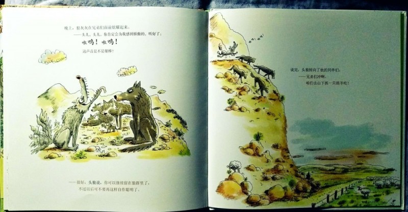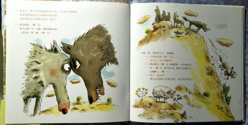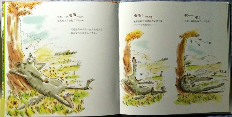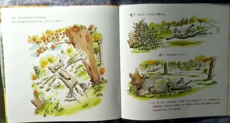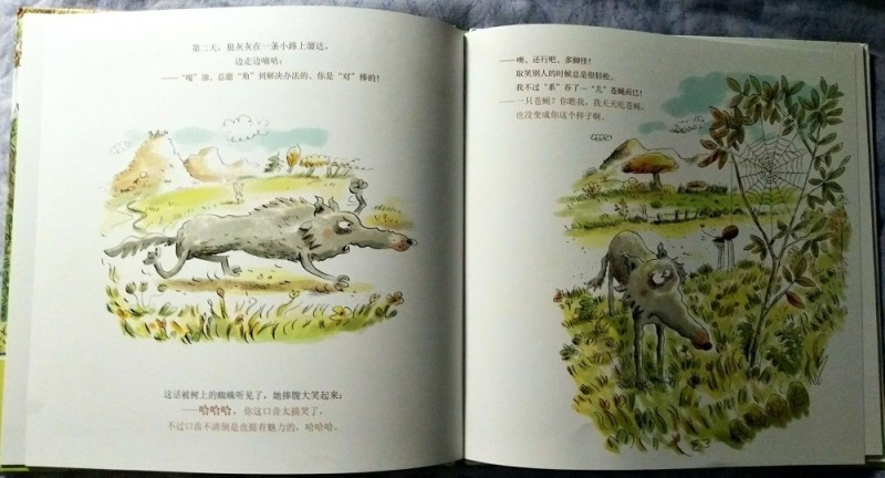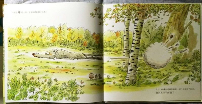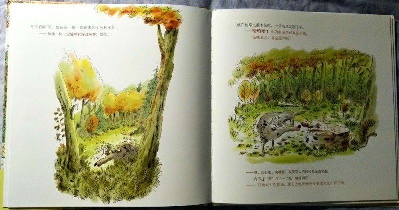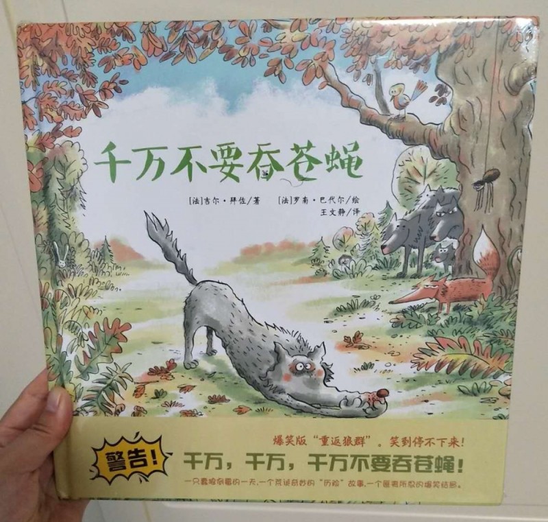 ![]() 拿到书,看到封面就被抓住了眼球。图书印刷非常精美,大开本的排版设计,使得画面呈现效果更完美! 从封面可以看出这本书的绘画风格属于清新自然又唯美型的,色彩搭配和画风非常赏心悦目,让人不自觉就有种走入画中,体验美丽的森林童话的感觉。 封面C位是一头有点儿抓狂的狼,周围是围观的小动物们,有狼群、狐狸、蜘蛛、小鸟,还有隐藏在远处的小兔子和小刺猬,还有躲藏在标题‘吞’字口中的苍蝇。 绘本从封面就开始讲故事了,可以看出故事都是围绕这头狼展开的,他到底经历了什么呢?一起来看看吧! 这头狼叫狼灰灰,一天午睡打呵欠的时候,狼灰灰不小心吞下了一只苍蝇,于是他的‘噩运’开始了!插画把狼灰灰的嘴巴画得特别大,有点儿夸张,却又特别有表现力。那大嘴巴打个呵欠,别说是只苍蝇了,就是只兔子也能一口吞了。 ![]() 吞下苍蝇后,狼灰灰开始口齿不清了。别的狼叫起来是‘嗷呜! 嗷呜!’而狼灰灰发出的声音却是:“嗡嗡——嗷呜!嗡嗡——嗷呜!”狼群爆发出一阵大笑。头狼生气地质问狼灰灰是怎么回事,狼灰灰回答:“我也不‘几’道,‘桃’儿......”,狼们笑得更欢了,有头狼笑得直在地上打滚。 儿子和我看得也都笑到停不下来。头狼却一直都没有笑,反而气急败坏地一再纠正狼灰灰,再反复尝试失败之后,头狼忍不可忍地把狼灰灰赶出了狼群。 ![]() 离开狼群后,狼灰灰自己给自己加油鼓气:“‘嗄’油,总能‘角’到解决办法的,你是‘对’棒的!”哈哈哈哈,儿子看到这里也笑得倒在了床上。书中的蜘蛛听到了也是捧腹大笑,嘲笑起狼灰灰来,说自己天天吃苍蝇,也没变成狼灰灰这样口齿不清。 听了蜘蛛的话,狼灰灰在心里打起了小九九:他想到了一个好‘局’意,如果他把蜘蛛吃掉了,不是就能‘七’掉那‘几’苍蝇了吗?哈哈,想到就马上做到,只见狼灰灰长大嘴巴,啊——啪!一声就把蜘蛛吞进口中。 ![]() 本以为吃了蜘蛛,就能恢复正常了,没想到事情变得更糟糕了:一团蛛丝从狼灰灰耳朵里钻了出来,而且蛛丝越拉越长,一直拖到了地上。更狼狈的是狼灰灰四只脚都被乱七八糟的蛛丝缠了起来,栽倒在了地上。 路过灌木丛时,狼灰灰的新造型又遭到了一只鸟儿的嘲笑。小鸟告诉狼灰灰他天天吃蜘蛛,一点儿事没有。听到这里,狼灰灰又故技重施,心想吃掉了小鸟就能把之前吞掉的蜘蛛吃掉了,麻烦就解决了。于是,他趁小鸟不备,瞅准时机,又是‘啊——啪!’一声就把小鸟吞了下去。 ![]() 然而,吞了小鸟之后,狼灰灰的四肢开始不受控制地上下扑棱起来,嗖的一声,狼灰灰像鸟儿一样一头冲进了荆棘丛,最后一头撞在了石头上。可怜的狼灰灰!真是史上最倒霉的一只狼啊! ![]() 正在狼灰灰遍体鳞伤,心灰意冷的时候,在一个交叉路口遇到了狐狸。狐狸看到狼灰灰的样子也忍不住哈哈大笑。不过他看狼灰灰很可怜,就给狼灰灰出了个主意,让狼灰灰从两棵紧挨着的树中间钻过去。狼灰灰费了好大的劲儿,皮都蹭破了,却卡在了树中间。伴随着一声巨响,之前被狼灰灰吞下的小鸟、蜘蛛和苍蝇伴随着一团气体被挤了出来。 ![]() “哈哈,狼灰灰放了一个大臭屁!哈哈。”儿子再一次笑到停不下来。 ![]() 这下,狼灰灰终于解脱了。他开心地回到了狼群,沉浸在恢复正常说话的幸福中,那神情真是没谁了,就像一个哑巴突然会说话的一样。其他狼都准备下山去抓羊了,狼灰灰还在撒欢地练着嗓子,虽然只是远远的一个影子和动作,就把其他狼嫌弃和不解的神情刻画得惟妙惟肖。真是只有经历过的狼灰灰,才能深切体会到恢复正常的幸福啊! ![]() 不过,吃了羊后的狼灰灰会不会有事儿呢? ![]() 哈哈,结局更加爆笑,倒霉的狼灰灰吃了羊之后开始这样叫了:“咩咩 嗷呜”,哈哈,惊不惊喜,意不意外?小朋友们可以脑补一下,以后狼灰灰吃什么就会有什么特征,还不知道会再变出什么口音出来呢。 爆笑的故事情节,真是让人笑得停不下来。和我一起看了一遍后,儿子忍不住又自己看了一遍,边笑边念:“好了,接下来就像跟孩子玩游‘气’那么简单了,我。。。。。。我‘梭’话怎么还‘系’‘介’个样子!哈哈哈哈......” ![]() 也许跟其他绘本相比,这本书没有多么高深的哲理,但是能让孩子看完还想看,看得开心愉悦,从而爱上阅读,这就是这本书最大的价值和意义所在。 而绘本清新明快的插画,也让阅读变得非常赏心悦目,更为孩子们学画画提供了借鉴的模板。插画中暗藏的小细节和小故事,也非常锻炼孩子们的观察能力。 比如从狼灰灰一出场就暗暗跟随的小白兔,仔细观察书中插画,几乎每一页都能找到小白兔的身影,有时候是躲在草丛中,有时候是藏在树林里。小白兔就像现实生活中的狗仔队一样,时刻跟踪追拍着狼灰灰。又好像是一个吃瓜群众,明明知道狼很危险却一路跟随,偷偷观察。可以说是一只超胆大的好奇兔了,哈哈。也许他想把狼灰灰的奇特经历编写成故事讲给其他兔子听吧,哈哈。看书的时候,寻找每一页中小兔子的踪迹,也成了儿子的一大乐趣。 这样的绘本相信没有孩子不爱。《千万不要吞苍蝇》,值得推荐给所有天真浪漫的小朋友们和童心未泯的大朋友们! 本作品未经作者许可不得转载,转载请征求作者意见。擅自转载使用,将保留追究其法律责任的权利! 个性签名