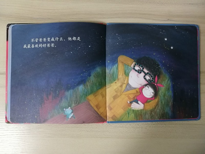 爸爸在孩子的成长过程中是一个非常重要的角色,孩子的童年如果能够在爸爸的陪伴下度过,那将会是非常幸福的一件事。但是大多数的爸爸由于这样那样的原因,陪伴孩子的时间并不是很多,这对于孩子来说是一个很大的损失。不过虽然爸爸不能总是陪伴在孩子的周围,那我们也可以通过书本来感受一下爸爸对孩子不一样的爱!所以看到关于孩子和爸爸的书本我会毫不犹豫地申请,希望这些书籍能够给家中的爸爸一点启示,让他也能参与到孩子的成长中。《爸爸变成了什么?》就是一本关于孩子和爸爸之间故事的书籍,在这本书中处处洋溢着爸爸对孩子的爱,幸福快乐展现的淋漓尽致!