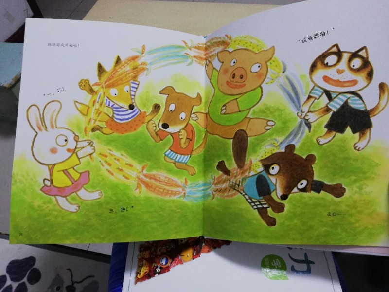 也不知道是谁的肚子咕噜噜叫了 大家嚷嚷着,别打了别打了,先吃便当吧,都饿了 于是,大家纷纷打开了各自的便当 哇,喵喵一看,原来他们也做了那么多的好吃的啊 有松饼、有寿司、有饭团、有煎鱼、有热狗 还有美味营养的蔬菜、水果... 喵喵默默得想,他们的便当看着很好吃唉,好想尝一尝呢 其实,大家也都想喵喵一样想的 不如一起分着吃吧 就这样,喵喵跟他的小伙伴们一起分享了彼此的美食 吃饱之后,顺便用包便当盒的手绢,系成了一条花花绿绿的漂亮绳子 喏,这样大家不就可以玩跳绳游戏了嘛 吃得满足,玩得开心,大家最后把漂亮的手绢绳子系在腰上 像开火车一样,一个一个回家啦!