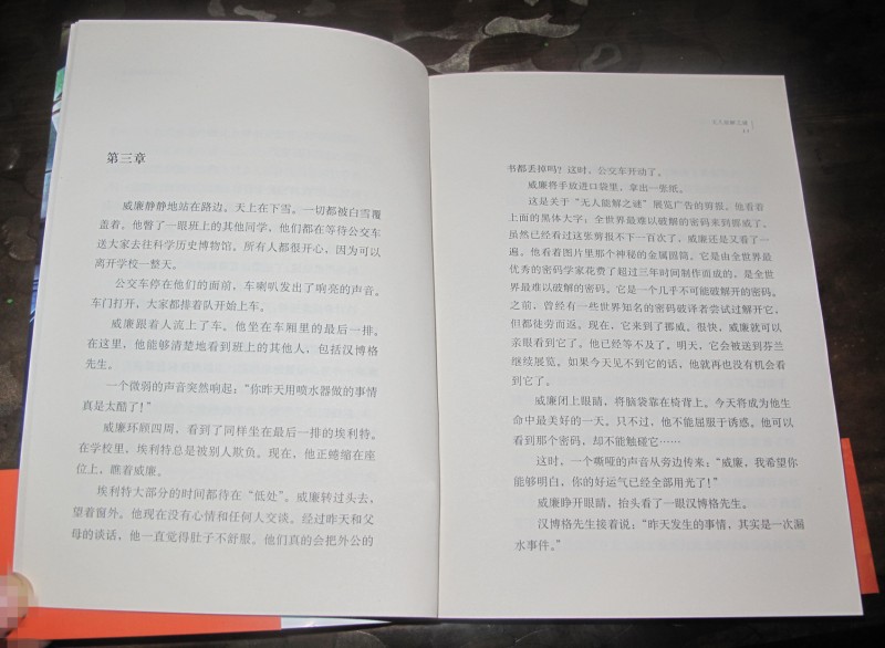 ![]() 话说这次试读的是《威廉·温顿无人能解之谜》,当时在申请这本书时还犹豫不决的,就怕孩子不喜欢看,谁知道当我把这本书的介绍给我家小子看时,他一看介绍说是被誉为《科幻版的哈利·波特》,加上又是《少年版的达·芬奇密码》,马上就很激动的就我赶紧的申请呀,因为他最近迷上了《哈利.波特》,所以特别想看看这本书又是什么惊喜的故事在等待着他呢。 首先我们还是从封面说起吧,封面的打底色是深蓝色,再加上图片上有各种各样的 比较夸张的花和动物,一看就是来至于未来世界的,而中间有个小孩在奔跑着,是有人在追赶着他吗?还是怪兽在追着他跑(这个怪兽是我家小子说的,最近看这种类型的电影比较多,所以也自然而然的想到了怪兽)。 《威廉·温顿无人能解之谜》这本书总共有240页,还是比较厚,但因为比一般的书要稍微小点,所以拿在手上倒也不是很重的感觉,这本书里面一共有四十二章,但除了第一章有标题以外,后面的四十一章都没有标题呢,让小朋友们忍不住的想继续看下去甚至是一般书里有的目录也是没有的,所以想知道这本书的精彩故事,那就必须认真又仔细的看下去,才能知道故事到底是什么。 话说一打开书的内页时,就看到第一章的标题 八年后,挪威的某处秘址 故事的内容很丰富。从开始讲述了威廉一家因为一场车锅,导致与外公下落不明,爸爸因此受伤要坐轮椅,可让人更加不解的是,他们不知道要躲避什么,全家都搬离了故乡,来到了挪威开始了新的生活,并且隐姓埋名。这也是故可以说是故事中埋下的伏笔吧。而威廉·温顿是个解密码的天才,尽管父母禁止他继续研究解密行动,可是威廉却在背地里依然坚持进行着,而且他特别爱看外公托比亚斯·温顿留下那几十万的书籍,要知道他外公可是全世界最优秀的密码学家之一呢,那里藏着无数的秘密,让威廉激发更深厚的兴趣。(这同时说明了威廉是个比较执着的孩子,你们觉得呢?要说这样的性格有好处也有坏处,就看自己怎么掌握好这种性格了,也可以说不同性格的人造就不同性格的人吧)。 在威廉偷偷参加了学校组织的科学历史博物馆活动中,(话说这样的活动孩子们应该都想参加的,至少我家的就很有兴趣参加的),让他有幸目睹了传说中的“无人能解之谜”展览,结果这位解码天才却在阴差阳错中破解了这个世界上最难的密码筒,从而让他威名远播,可后面发生的一系列的故事,甚至是全家都遭到了攻击,而他自己则是被带到了后人类研究所,那里的一切都让人匪夷所思,到底有些什么状况发生呢?这里就不一一详说了,还是稍微留点神秘感吧,让喜欢看这本书的读者们自己继续深入的看进去吧。 这本书是本科幻类的小说,纯文字的,适合上了学的孩子阅读的,同时这本书里面的想象空间是非常的大,用我家小子的话来说,就象哈利波特一样,随时随地都有意想不到的故事发生的。 ![]() ![]() ![]() ![]()