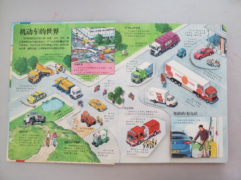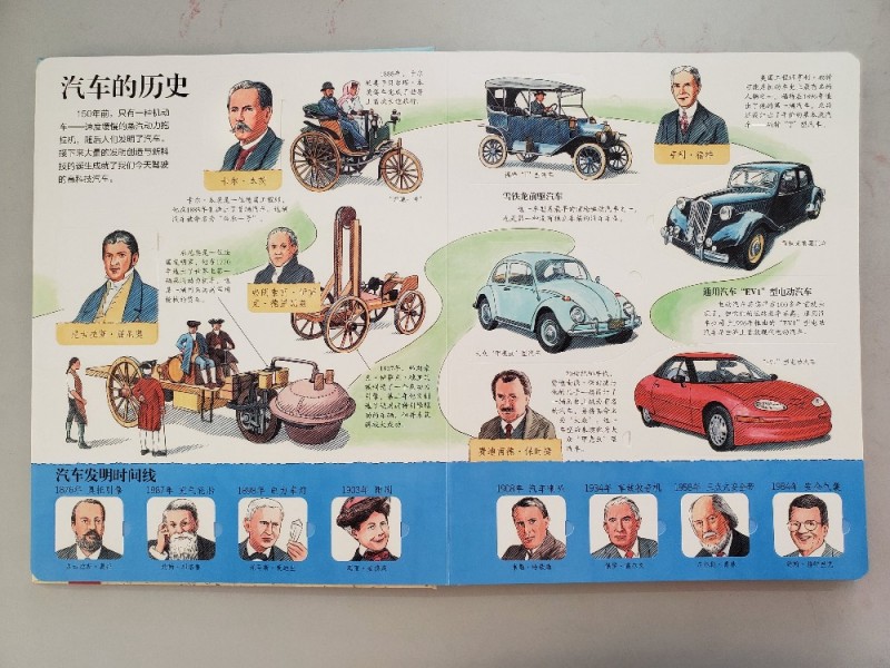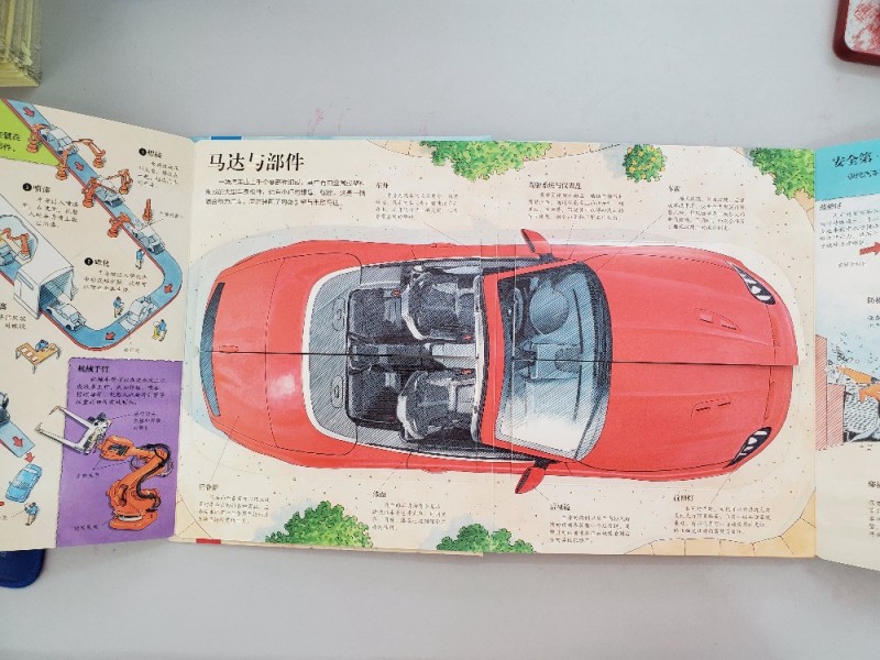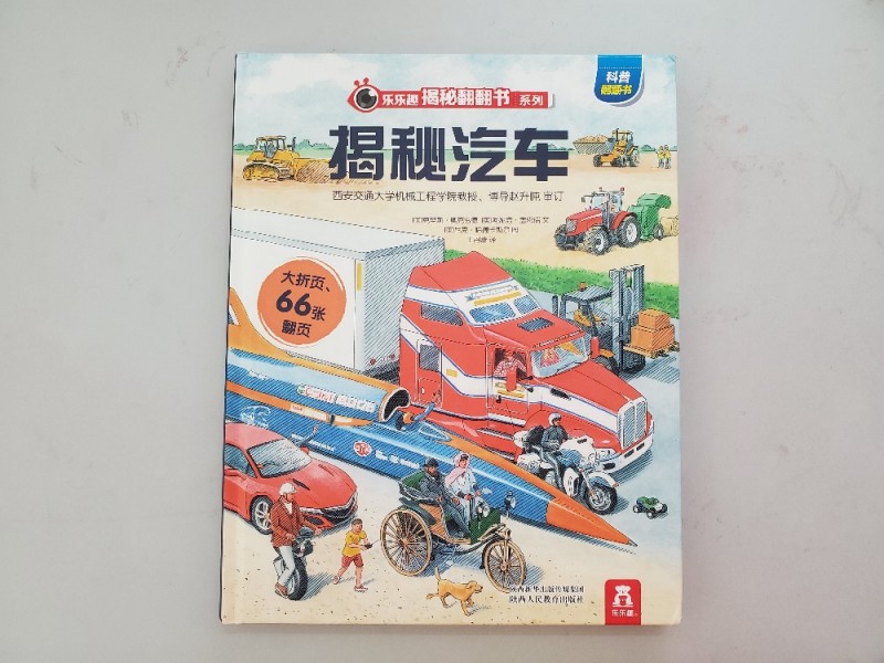 乐乐趣的揭秘系列大概的有五十本左右了,天文地理、生活常识、诗词歌赋各种科学知识等,涵盖的内容太广泛了。非常适合三至十二岁的孩子阅读。在翻一翻中增加了探索欲望。不知不觉中掌握了很多知识。之前也有幸试读过两本。孩子特别喜欢。今天很试读的揭秘汽车,简直就是让我儿子疯狂啊。而且我女儿最近也对认识车标了解汽车感兴趣。正好姐弟两个可以来一场汽车的视觉盛宴了。这本书里面太多的汽车没有见过了。有的甚至都没有听说过。一起大饱眼福。书本内翻翻看的设计,不仅工艺要求很高,设计也极其的精妙,让孩子很容易就有了空间和两者之间逻辑关系的记忆。鼓励孩子去探索和发现。 本书是十六开大精装硬皮书,非常的精美。送人、收藏都是极好的。这本书的作者是两位英国儿童科普书作者。有着丰富的经验更是热爱生活的人。审订人是西安交通大学机械工程学院教授、博士生导师赵升吨。也是一位在汽车领域经验丰富的专家。 汽车现在是非常常见的交通工具了。我想很多人出行都已经离不开它了吧。很方便有效率。但是大家只是把它当做交通工具,一种工具而已。你了解汽车吗?北京有一个汽车博物馆,我们还没有去过。看介绍还是挺不错的。这本书有一个大折页还有66张翻翻页。机动车包含轿车、卡车、巴士、摩托车等。是靠内燃引擎或者电动马达驱动。汽车都是需要燃料驱动的,原来都是汽油和柴油。现在又增加了电和电油混合的燃料。 如何制造出汽车是一个大折页,一辆红色的敞篷车一下子就跃入眼帘。平时大家只是看到了车的外表,如果能看到内部构造,孩子也会是特别的兴奋吧。翻开看看吧,这辆汽车是一套混合动力传动链,它的内燃引擎与电动马达会协同工作。应该是动力特别足吧。就像电视上一启动就呜呜呜的响。里面还有一块又大又中的电池。还有电池冷却系统为电池降温。还有刹车装置,这可是非常重要的。在前机盖下面装有电动马达、智能电子器件、全轮驱动和内燃引擎。书中还有一页以流水线的形式讲述如何造出汽车。大概是焊接、磷化、喷漆、引擎、车轮、挡风玻璃、装配完成和准备出发。后面还介绍了引擎如何工作、汽车的历史、高速汽车、货运物流和摩托车、特种车辆和未来的机动车。学习知识的同时提高孩子的安全意识。