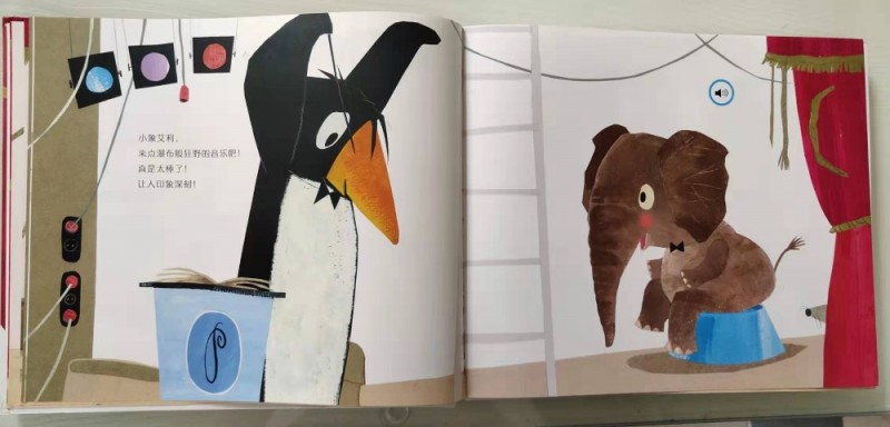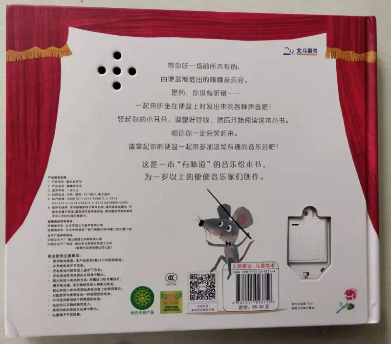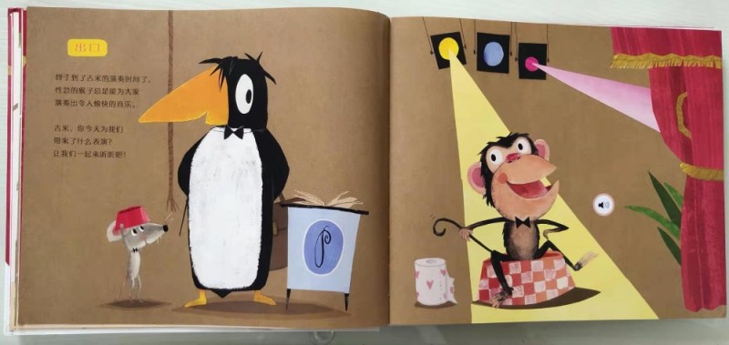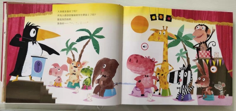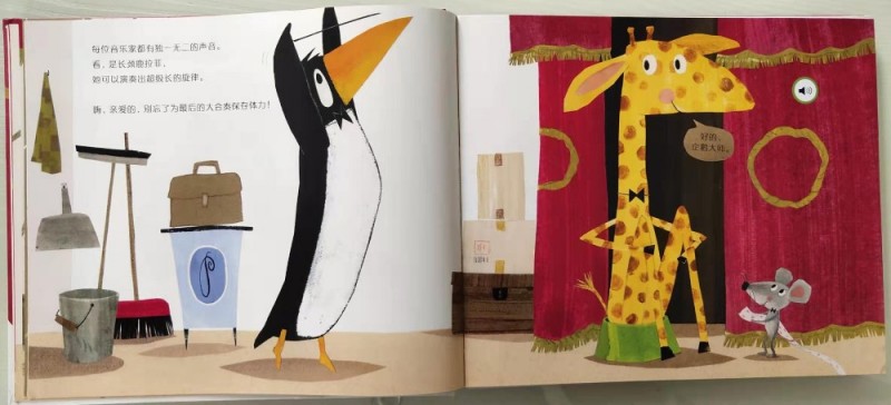 图书印刷精美,图书尾封设计了电子电池、开关和发声音孔。单单看图书的背面还以为是个别致的玩具呢!不得不说现在的童书做得真是越来越新颖,越来越有趣了,自然也越来越吸引小朋友们了。 ![]() ![]() 那么,就让我们一起来欣赏这场《噗噗音乐会》吧!首先,欢迎乐队成语们闪亮登场——猴子吉米、兔子科比、长颈鹿拉菲、斑马泽布、河马雅克、小象艾利、青蛙尤安娜、小狗乔治、小猪奇奇,还有古灵精怪的小老鼠米尼。哇!好豪华的阵容啊!咦!它们手里拿的都是什么啊?豪华,原来是各种颜色各种尺寸的便便盆啊,哈哈。噗噗音乐会,原来是这样,哈哈。 ![]() 那么音乐会的灵魂人物,乐队指挥是谁呢?原来是企鹅先生啊。在企鹅先生耳中,生活中到处都充满着动听的音乐:小老鼠的脚步声、手机轻柔的铃声、鸟儿的歌唱声...... 而企鹅先生的伟大之处还在于,他既能捕捉和发现生活中各种美妙的声音,他还擅长把各种原本平淡的声音加以改造然后混合在一起组成一场盛大又别致的音乐会,就比如这场——噗噗音乐会。 ![]() ![]() ![]() 企鹅先生的工作量可不小,首先他需要一个一个地‘改造’乐队成员,让它们一个一个地懂得按出场顺序出场,在自己的便盆上坐好后再开始‘演奏’。他还要教会乐队成员们把握好节奏,还要注意控制音量。渐渐地,大家都进入了状态,青蛙尤安娜的演奏就像春天山里的溪水一样,美好自如地流淌;小象艾利的演奏就像瀑布般狂野;斑马泽布的演奏让人身心愉悦;长颈鹿拉菲则演奏出超级长的旋律......在企鹅先生全身心的投入和努力下,所有的乐队成员也都配合完美,排练效果完美。 ![]() 好了,该开始大合奏了!所有乐队成员都舒舒服服地坐在了自己的便盆上,聚精会神地听从企鹅先生的指挥。哇!企鹅先生就像一位指挥千军万马的大将军一样有气派!一场完美的噗噗音乐会成功谢幕! ![]() “哈哈,真是太有趣了!”相信所有看过这本书的人都会不由这么赞叹。而更有趣的是只要动动手指,按一按书中所有喇叭音符标志,都可以听到小动物们‘演奏’出来的各种美妙的声音,有的悠扬,有的高亢,有的婉转...... 说到便便,那可是难登大雅之堂的事情。谁能想到天才音乐家企鹅先生居然能在便便中发现美妙的声音,并把小动物们都召集起来,一起合奏出这么别致又这么美妙的噗噗音乐会呢!这是一场‘有味道’的音乐会,同时也是一场别开生面的音乐会。估计很多接触到这本书的小朋友们都会忍不住也拿上自己的便盆,加入到噗噗音乐会中来呢,哈哈。 ![]() 儿子也被这场设计巧妙、别出心裁的噗噗音乐会深深吸引了,一有空就会打开书上的电池开关,一页一页地反复看,反复用手按,反复听各种小动物们发出的有趣的声音。还忍不住跟着音乐手舞足蹈起来,这样的阅读体验还真是第一次呢,真是让孩子爱不释手了呢! ![]() 书中的插画也可以说是构思巧妙,非常用心!仔细观察你会发现,虽然都是同样的场景,但是每种动物出场时的画面细节都不一样。而每一页企鹅先生细微的表情和体态变化也非常传神地表达出了每种动物便便时的情景。在每一页都会出现的小老鼠米尼也是一大亮点,寻找每一页中的米尼也会是宝宝们阅读时的一大乐趣! 值得一提的是书中的插画是著名的拼贴画风格,拼贴画的设计使得画中的人物角色都更加立体更加传神了。这种拼贴画风格儿子也特别喜欢,经常运用到自己的绘画中。 除了有趣的故事和触控发声设计,以及别致的拼贴画风格,通过阅读这本书,小朋友们还可以零距离地听到各种小动物们真实的声音,近距离地认识各种小动物们的特点,在嘻嘻哈哈的开心阅读中了解了很多科普内容。也更加深了孩子们对小动物们的喜爱。 《噗噗音乐会》,真是一本‘有味道‘’的音乐绘本,给孩子们带来完全不一样的阅读体验! 本作品未经作者许可不得转载,转载请征求作者意见。擅自转载使用,将保留追究其法律责任的权利! 个性签名