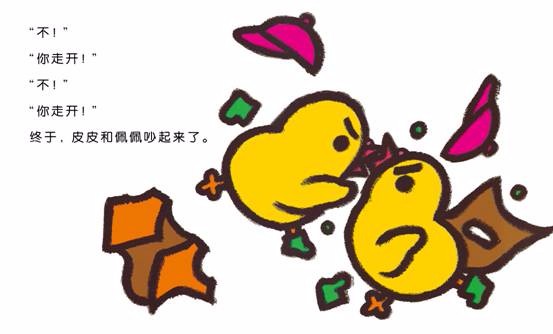 书中每个故事的情节变化都是在前一个事物的基础上一步步、一点点发生的,如《双黄蛋》里,两只小鸡从蛋里出来后,先穿一样的衣服,下一页增加一样的鞋子,再下一页是一样的帽子……这让孩子可以慢慢去观察、发现,而不是突然就从一个东西变成一个完全不认识的东西。