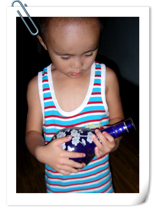 谦谦在对妈妈讲:“我喜欢这个青花瓷”。 某天晚上看王刚主持的“鉴宝”节目, 其中里面有个瓶子就是因为假的被当场给砸掉, 谦谦看的时候可心疼了,小家伙说瓶瓶碎了,多可惜啊!!
