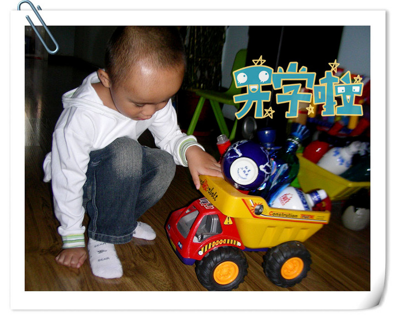 把装瓶瓶的翻斗车拉出来后数了数里面的瓶瓶, 然后拿出一个小家伙最喜欢的瓶瓶
