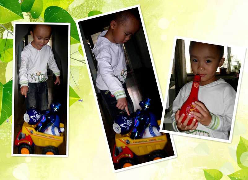 这是第二天早上去幼儿园之前小家伙在玩瓶瓶......
