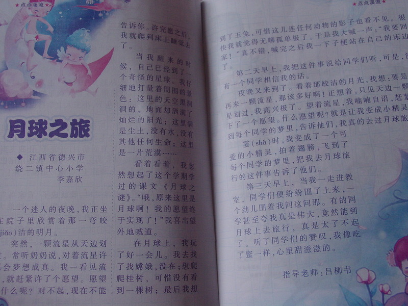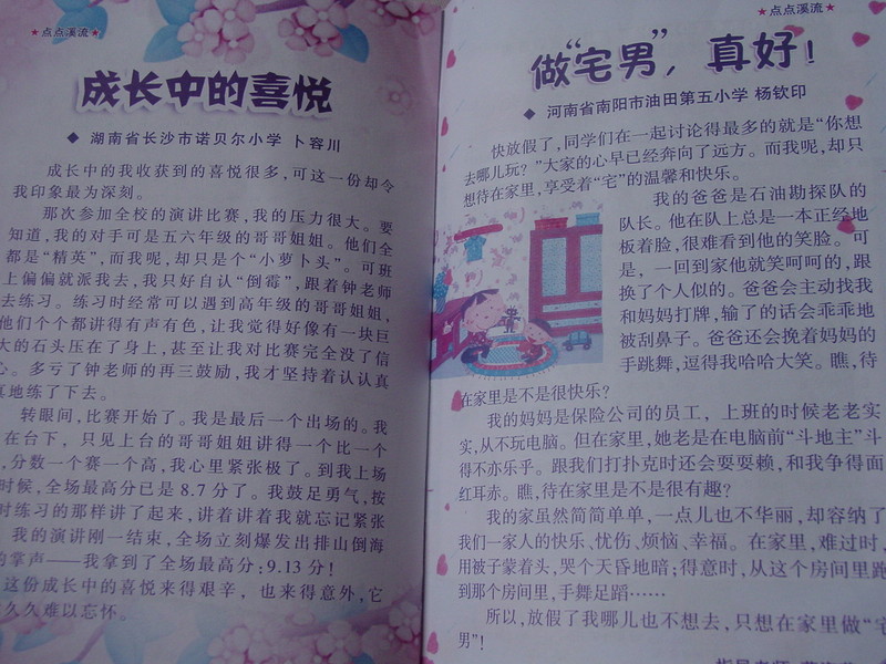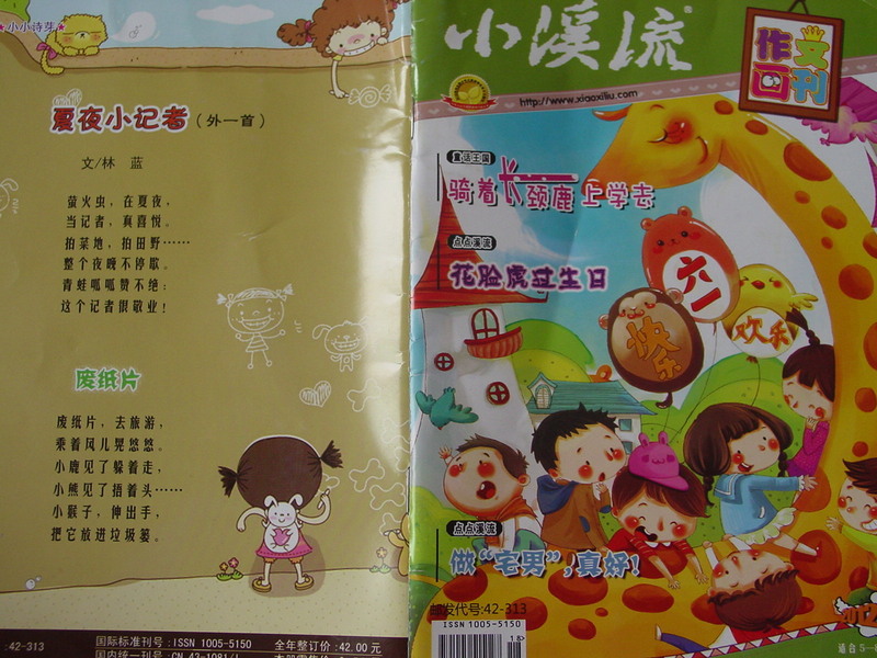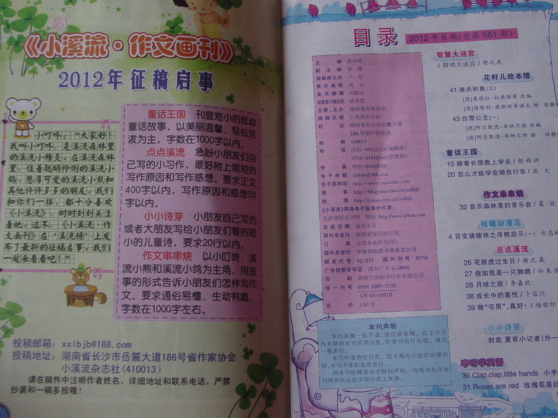 刚拿到这本杂志的感觉是自己又回到了小学时代,记得那个时候学校订阅的什么《小学生必读》之类的杂志就是这么的小巧可爱! 但是封面却没有这么的漂亮,卡通,文章的标题也没有这么有趣哦,那个时候就是我的爸爸,我的妈妈之类的文章!现在的文章可是特别的前卫哦,而且还有很多的网络语,比如宅男啊!呵呵! 当我打开第一页的时候,一下子感觉不一样了,因为这迷宫游戏可是孩子门都喜欢的哦!开门见山就是孩子们的最爱,这杂志的编辑真的能够掌握孩子们的心理呢! 我朋友的孩子学习特别的优秀,他就给自己的网名起的是猪猪侠,我才知道猪猪侠是一个动画形象,哈哈!想必没有孩子不喜欢这动画故事哦! 终于进入了正文!开始目录!听听这名字,“作文串串烧”“小小诗芽”“童话王国”“智慧大迷宫”哈哈,每一个栏目都是这么的有趣,孩子们怎么能够不想往下看呢! 还有征稿启事,和孩子们一起互动,发表一些孩子的优秀作品!贴近孩子的生活,真不错哦! 这个骑着长颈鹿去上学的故事,真的很有意思,我家宝贝一边看一边哈哈大笑,因为有注音,不认识的字,自己就能够拼读出来!虽然好几页的长故事,宝贝还是复述给我听了! 知道孩子们都喜欢动物,所以每个故事的主人公都是动物哦!小狐狸的形象,孩子还是很喜欢的! 来看看孩子们自己的文章吧,真的很天真,也很感动!出自孩子自己的手笔,就是让人觉得很有想象力!记得自己小时候最最羡慕那些能够在杂志上发表文章的小学生了!自己还偷偷的按照地址给杂志社寄去了自己的文章,可惜都是石沉大海,因为那会儿,邮费和信封都要自己买,而自己的零花钱又特别的有限,所以之后就没有再坚持了!现在我对宝贝说,只要你有自己喜欢的文章,妈妈就大力支持你哦!可以给杂志社投稿!当然现在都是发电子邮件了! 哈哈,还有英文儿歌呢!不错,不错,其实语言都是相通的,英文的诗歌也是讲究押韵的哦!英文和中文都有自己的美! 合格音乐森林里的音乐会在我们那个时候应该属于命题作文了吧!但是现在却不是说的这么死板,而是要引导孩子去无限的想象,写出自己想出来的音乐会的场景!每个孩子肯定写出来的都不一样哦! 孩子自己的文章哦,这一看就是高年级的孩子的作品!语言都成熟很多,也是非常的有趣,还是宅男呢,呵呵! 书最后附赠了一些国外的著名绘本故事! 《渔夫和鱼》的故事,是接着上一期的,看到了大结局! 这个是《白雪公主》的故事,刚刚开始,却没有结局! 对于这个花籽儿绘本馆的故事,我不太喜欢,这分享的故事都是非常老套的,而且没有很完整的故事情节,编辑应该好好设计版面,每一期都和孩子们好好分享一个完整的,好 绘本,这样孩子才能够感觉这本杂志是完整的,有特色的,这些我们70,80后看的故事现在的00后根本就不感兴趣哦! 后面封面的这首诗还是很有意思的哦!不知道是不是孩子们的作品呢,如果是孩子的作品,应该有孩子的学校班级哦! 总体感觉《小溪流》这本杂志还是很朴实,很经济,很丰富的,当然也有需要改进的地方,期待《小溪流》会越办越好! 本作品未经作者许可不得转载,转载请征求作者意见。擅自转载使用,将保留追究其法律责任的权利!