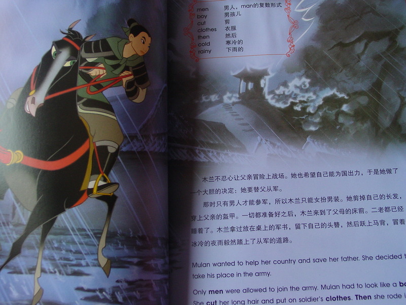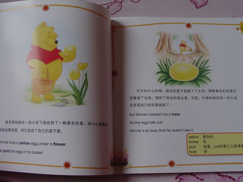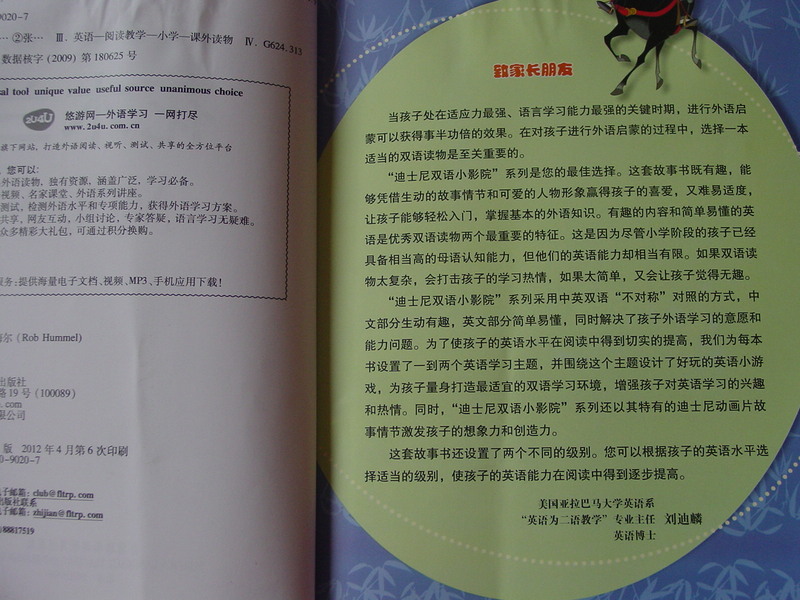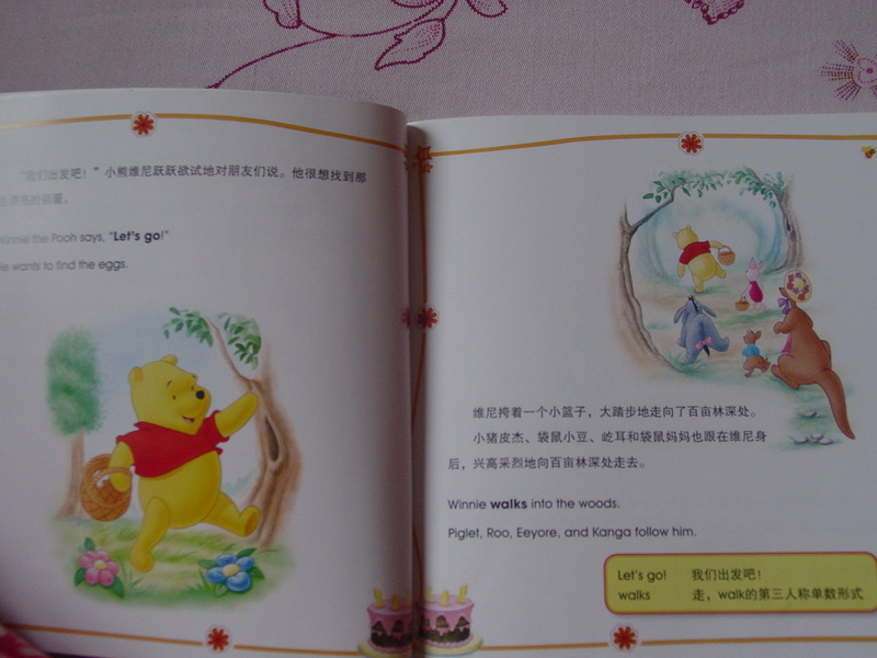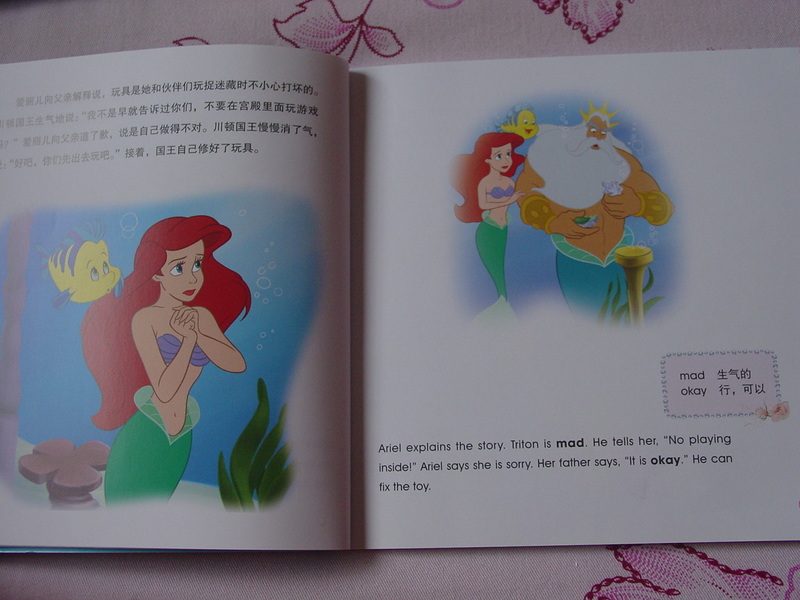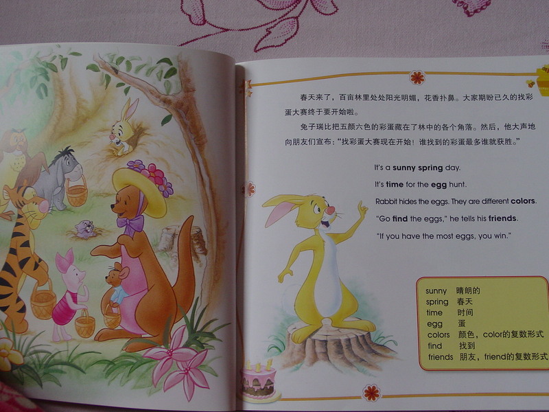 很幸运的得到了外语教学与研究出版社出的新书,我家宝贝刚好在学习英语,对于这些动画又特别的熟悉!所以马上就爱上了这三本好书! 花木兰的故事家喻户晓!知道被迪士尼变成了电影,才走进全世界人们的视野!我们中国人对于这个人物形象还是特别的喜欢,我家宝贝之前听爷爷讲过这个故事,我也找来电影给他看,现在再看绘本就更加的熟悉这个人物了!我这次用英文来阅读,宝贝虽然没有主动跟读,但是也没有拒绝!这本书属于迪士尼双语小影院的第二级的一本,主要锻炼孩子对于家庭成员,和人物,这些单词的练习!这册书包含了600多个单词,对于6岁的阳来说有点儿难了,但是他并不排斥,而是很喜欢!期待等宝贝大一些了,就会爱上这本书,和里面的英文原文! 记得上初中刚学英语的时候,就很觉得这26个字母很神奇,不同的组合发不同的音,越是简单的单词,用法就越多,功能月强大!虽然很难记,但是我还是喜欢上了英语!后来上了大学,我选择了英语专业,发现我们的教材都是外语教学与研究出版社出版的!于是我就对外研社出的书特别的有感情!现在我有了宝贝,给宝贝买的书好多都是外研社出的好书,这次又收到了迪士尼英语家庭版的好绘本,马上就好宝贝一起分享了!宝贝最喜欢迪士尼的动画了,看到这些都是自己喜欢的卡通形象,马上就跟着妈妈进入了角色! , 本书后面还有单词表,单词热身,单词猜猜看等游戏,练习,让孩子对于学过的单词能够更加牢记!真是不错的一套书哦! 发现这本书的奇特之处了吗?哈哈,对了是双面看的书哦!一面一个故事,可爱吧!小熊维尼,寻找复活节彩蛋的故事,这里叫做逃跑的彩蛋!这个故事宝贝也从动画里面看过了!这饿故事主要是让孩子学习关于颜色的单词!刚好孩子在幼儿园里面学过这些单词了,重新复习,宝贝能够一下子自己读出这些单词,很有成就感的哦! 另外一个屹耳,生日快乐的故事,也是深刻在宝贝脑海里了!和大家一起唱英文的生日歌曲,了解生日的一些英文单词! 书后面还有维尼英语小学堂让,涂色练习,彩蛋找妈妈,找一找,连一连的练习,宝贝可是十分喜欢做的哦! 宝贝因为是男孩子,所以对于芭比娃娃,美人鱼都不是很感兴趣!也许是周围的女孩子都说着是女孩子看的,所以宝贝就不自然的有了性别的认识! 刚刚拿到这本书的时候,宝贝就大喊:“哇,女孩子的书啊,给姐姐看吧!”可是当我把故事讲给他听的时候,他就爱不释手了! 这是迪士尼公主幸福双语故事中的一本哦!同一系列的还有《完美果酱》《爱的礼物》《温暖大扫除》这个故事是《海洋音乐会》。仔细阅读,感觉里面的故事很可爱,它打破了传统的关于美人鱼的故事,而是很创新的结合孩子的生活,让美人鱼更加生活化! 可爱的美人鱼爱丽儿,有些粗心,但是她很有爱心!和自己的姐妹能够友好相处,原谅别人!幸福是一个用很的话题!什么事幸福呢,有时候幸福来自于个人的心态,对未来充满憧憬就能够心情舒畅,有时候幸福来自于和别人的互动,赠人玫瑰手有余香,幸福来自于帮助和分享,来自于真诚和谅解来自于爱喝梦想,你家宝贝对于幸福的理解是什么呢?让宝贝一边学英语一边感受幸福吧! 好书,值得每一个孩子去阅读,好书,会吸引孩子,让孩子爱不释手! 本作品未经作者许可不得转载,转载请征求作者意见。擅自转载使用,将保留追究其法律责任的权利!