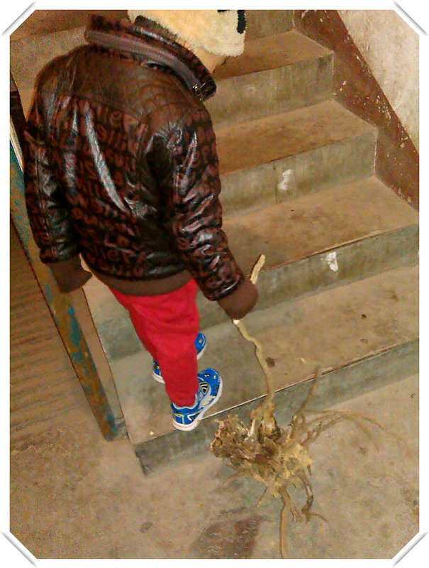 小家伙为了扫地,就摔树根,然后在打扫地板上从树根上掉下的泥巴。