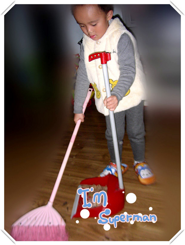 小家伙很喜欢扫地,看这扫地的劲头还挺像样吧。