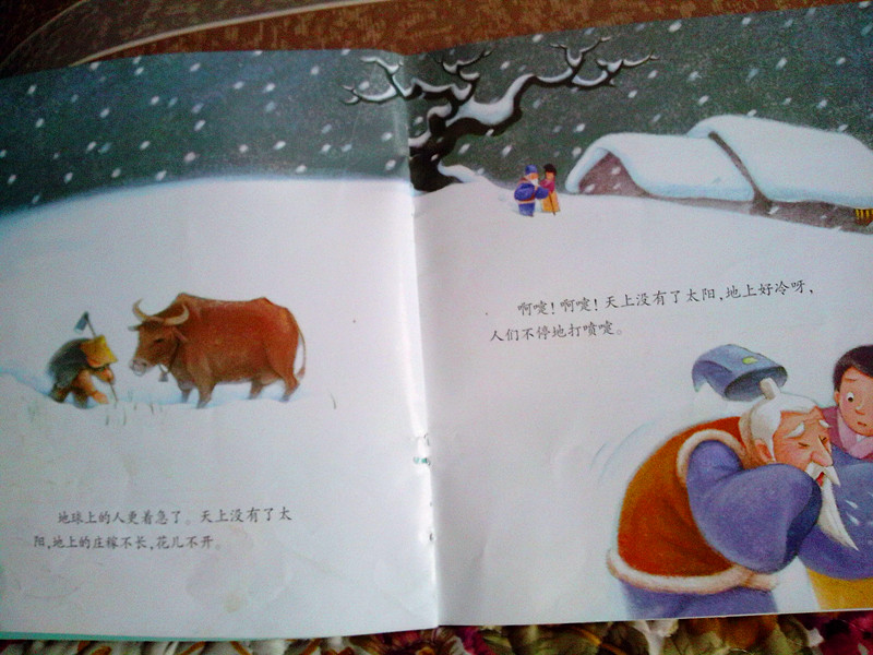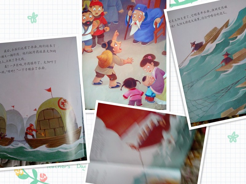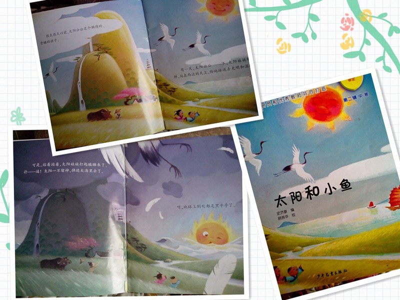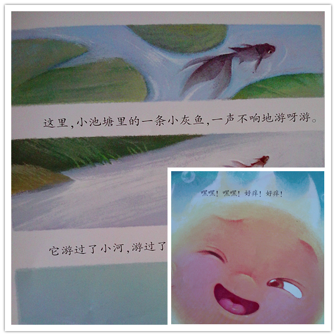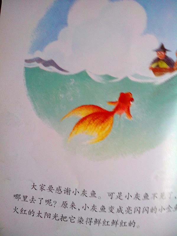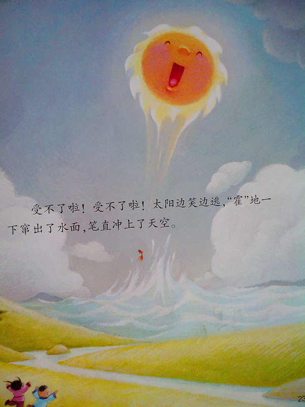 有一天,他跟平常一样站在天上,给地球送来光明和温暖。 可是站着站着,他就慢慢打起瞌睡来,一栽一栽地,扑通一下子,太阳一不留神掉进大海里了。 这可怎么办呢?地球上到处黑乎乎的。 ![]() 这可急坏了地球上的人。于是大家一起商量怎么把太阳弄上来。 ![]() 先是水手们找了根粗绳子,拉到半道儿绳子断了;接着渔民们用织好的大渔网套住太阳,结果因为太阳太重把网弄破了;最后士兵们用炸药轰太阳,结果他嗖一下子就蹦出了大海。 可是太阳经过人们这一折腾,也乏了,干脆下班得了,于是他又顺势滑进了大海里继续睡他的大头觉。地球上还是黑乎乎的。 ![]() 除此之外,地里的庄稼也不长了,花也不开了;人们都感觉很冷,躲在家里也不能出门,小伙伴们也只好在家自己玩。 这时候,小灰鱼一直游一直游游到太阳胖嘟嘟的大肚子旁边用鱼鳍呵太阳的痒痒。不信,你瞧 ![]() 太好了太好了,太阳出来了。好暖和呀。 老人和孩子还有地球上的所有的生灵无不欢喜。 ![]() 后来,人们把小金鱼放在一个很大很漂亮的水缸里。每到晴天的时候,太阳一看到小金鱼,就会想起从前呵痒痒的事,然后就会把阳光抖得大地大片大片金黄。 这个小故事把太阳对人类的生活的重要性通过趣味性的故事展示给大家,很容易让宝宝接受;还可以借此打开宝宝的想像的门库。尤其是“呵痒痒”这个情节,给人一种很温馨的生活气息感。不妨和孩子挠痒痒试试吧。 还有就是可以让宝宝动手画画太阳、小金鱼、小船或者动手折纸也可以呀。 本作品未经作者许可不得转载,转载请征求作者意见。擅自转载使用,将保留追究其法律责任的权利! |