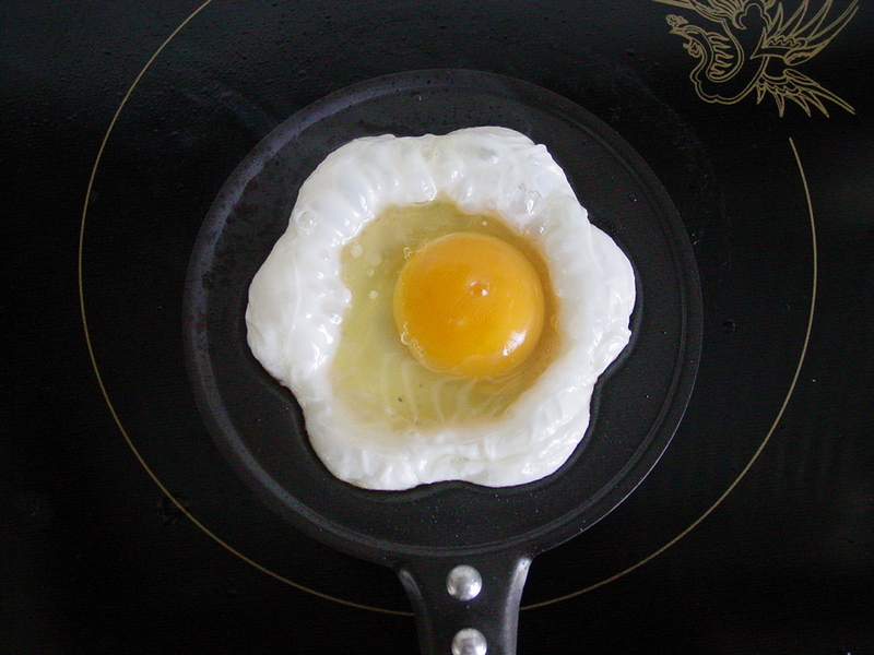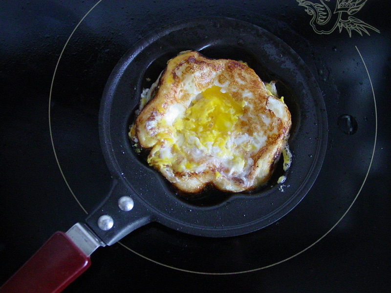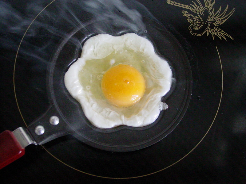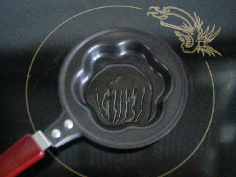 看看这锅,放在电磁炉上面的比例,就知道有多小了!呵呵,和手掌差不多大!不过看锅的材质还是不错的哦! 先倒上一点儿油哦,妈妈说新锅要多放一些油! 等油热了,就赶紧打一个鸡蛋进去,天,一个不大不小的鸡蛋差点儿流出去了!看来这锅的容量真是为一个鸡蛋设计的!不过看到鸡蛋在上面的感觉,真的很小巧漂亮呢! 蛋清都开始膨起来了,可是蛋黄还是很安静的呆在那里,看到升起的缕缕轻烟,难道是要糊了不成!我赶紧拿来小铲子,把它翻了个!这下可好,一下子变难看了,由白雪公主变成了灰姑娘了! 变的不漂亮了,呜呜呜呜,要是一开始就小小的火,就好了!不过还是熟了,等阳阳回来,再做第二次试验吧!阳阳肯定会非常喜欢这个小锅的,一看到那花型就可能要让这效果属于他了!呵呵呵!也许下次我们除了做鸡蛋还可以做别的东西呢!蛋糕,煎饼,呵呵,随便什么都可以,只要喜欢!现在证明可以用电磁炉来加热了,才是我这次试验的目的! 本作品未经作者许可不得转载,转载请征求作者意见。擅自转载使用,将保留追究其法律责任的权利!