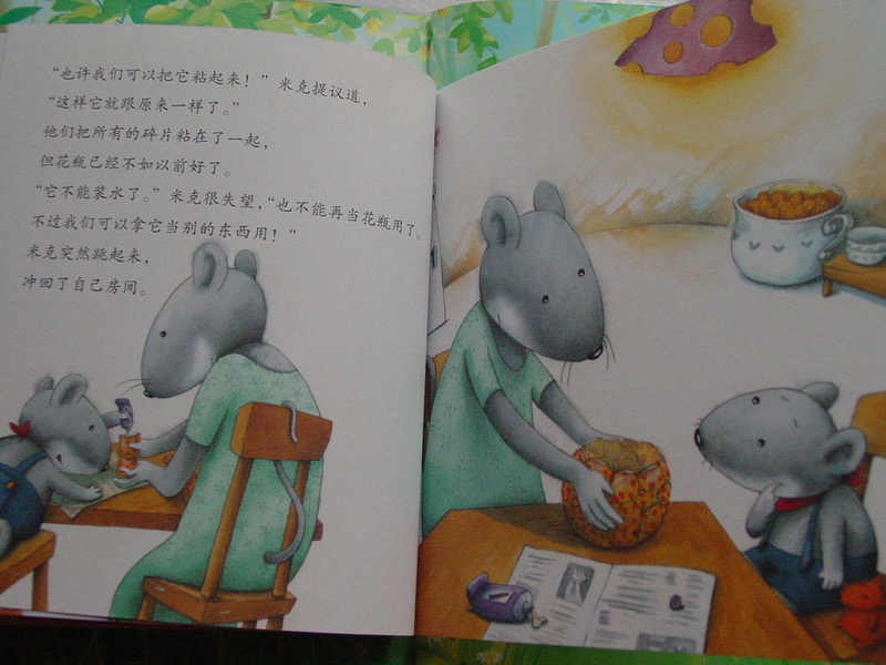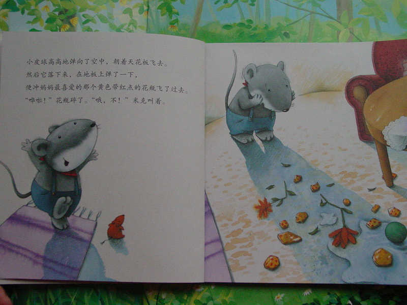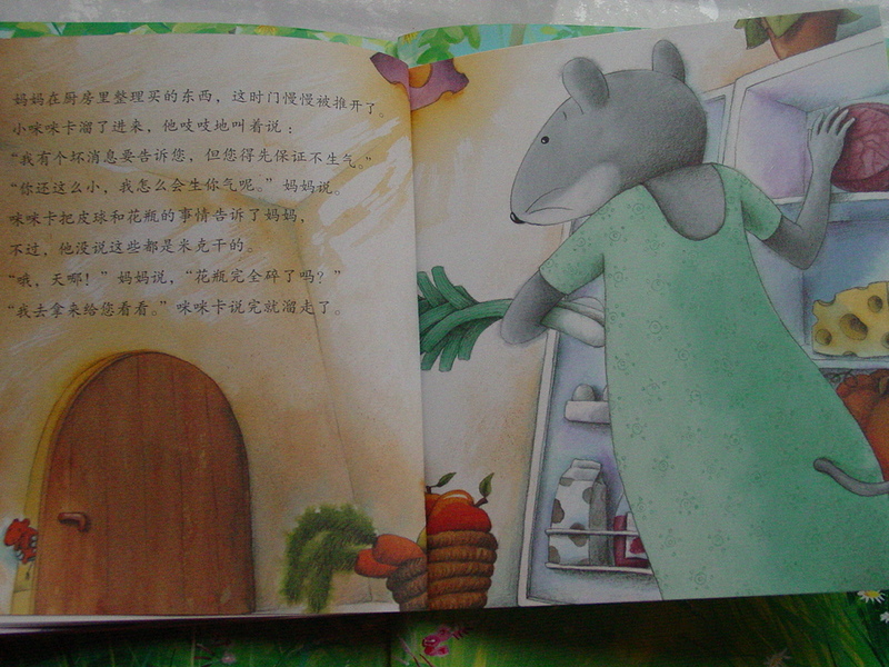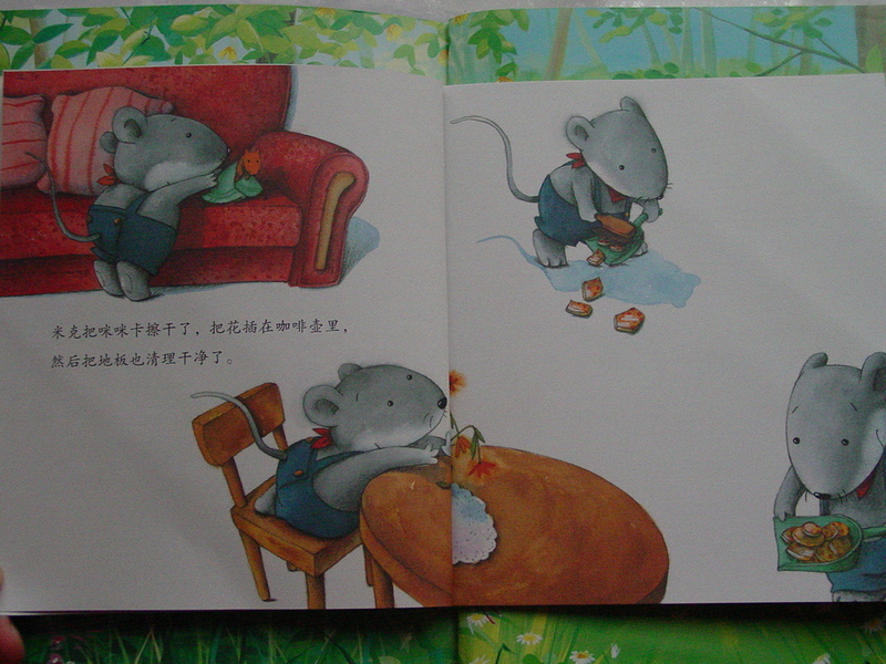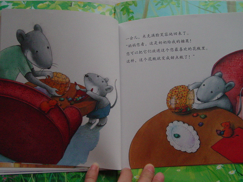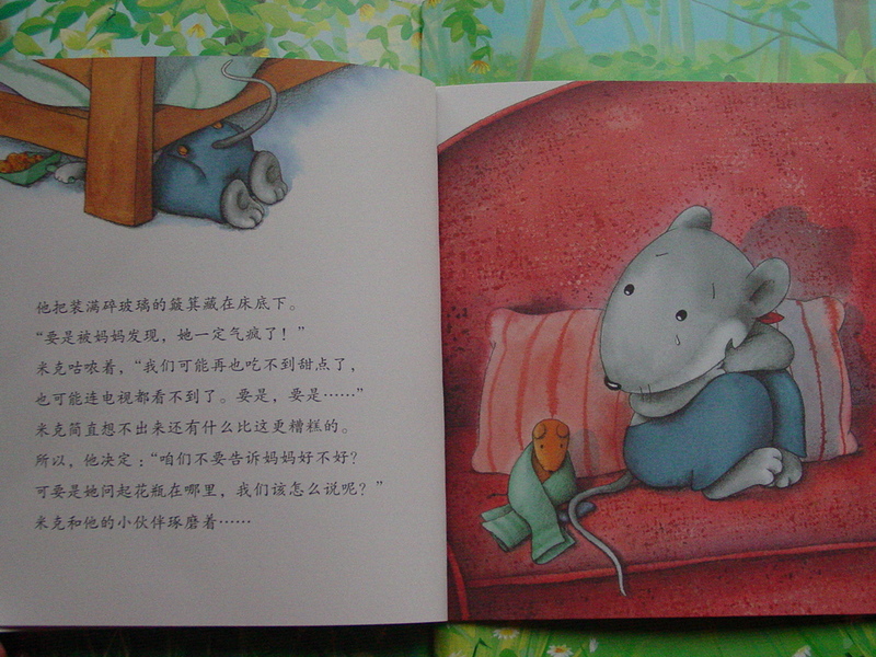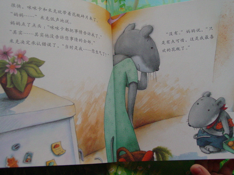 家里有关小老鼠的绘本可真是不少!“宝贝告诉妈妈,你知道关于老鼠的书都有那些呢!”《“爱心书小弟》《14只老鼠系列》《7只老鼠》《爱跳舞的老鼠》《猫和老鼠》《舒克和贝塔》《黑猫警长》······”天,我们家的小老鼠还真的不少呢!可是今天啊,妈妈给阳阳带来了一本新书,这本书里也有一只小老鼠,而且是一只敢于承担责任的勇敢,调皮,可爱的小老鼠!一起来看看这本可爱的小书吧! 看看封面的这个小老鼠在干什么呢?地上乱糟糟的花瓶碎片,天,他一定是闯祸了! 这只可爱的小老师名字叫米克!他也和你一样喜欢玩,有些淘气哦,什么事情都想试验一下! 孩子都是充满好奇心的,什么都想试一下,就是想知道这皮球能不能弹到天花板上,可是却不小心打碎了妈妈最喜欢的花瓶,唉,小老鼠也不想这样啊! 怎么办啊?孩子犯了错误之后都是十分的惊恐害怕,内疚的!这时候的孩子的内心是最最脆弱的哦! 现在最最要紧的就是赶紧收拾残局啊! 我想要是家务活,孩子肯定没有这么麻利!呵呵! 一切都收拾完毕之后!俩孩子开始在想办法,如何应付妈妈回来之后的狂风暴雨! 看米卡的脸上都有泪珠儿了,可见自己内心肯定后悔极了!如果我是米克的妈妈,我一定不会太凶! 米克想过要撒谎,说是小偷来偷走了花瓶,可是又想想实在是不妥当! 看看咖啡壶里面的那几支垂头丧气的花儿,就知道米克的心情此刻是多么的沮丧了! 最后还是米克战胜了自己,不过自己还是没有足够的勇气,还是弟弟咪咪卡把事情告诉妈妈!但是咪咪咔说话很有技巧的哦,要让妈妈先保证不会生气!天,难道天下所有的妈妈都会河东狮吼吗? 妈妈么有生气,而是原谅了米克!这个妈妈真棒啊!看到充满悔意的孩子,妈妈知道河东狮吼是根本解决不了问题的,打骂一顿不但换不回好的花瓶,还会让孩子内心的悔意消失!而是后悔自己为什么不撒谎瞒过妈妈,那么以后孩子再犯错误,想起妈妈的河东狮吼,宝贝是绝对不会告诉妈妈实情的! 妈妈的原谅让小鼠米克来了灵感,把那些碎片都粘起来!做成了一个新的花瓶! 新的花瓶虽然不能再装水,做花瓶用了,但是,但是,呵呵,又是米克的新灵感!新的花瓶可以来装糖果,当一个漂亮的果盘哦! 看到儿子给自己的嘴巴里面塞他最爱吃的糖果,这时候的母子俩一定是世界上最最幸福的!虽然碎了一个花瓶,但是加深了孩子对妈妈的信任,让母子俩的感情更深了! 看完了这本书,我问阳阳,如果是你,你会对你妈妈撒谎,还是直接告诉妈妈实情呢!我的内心也在打鼓,不确定儿子会如何回答我!因为我就是属于河东狮吼一类型的妈妈,孩子犯错误,我有时候会忍不住发很大很大的脾气,我看到过孩子看我的那惊恐的眼神!可是我还是控制不住自己!现在看了米克妈妈的做法,我真的要好好学习了!宝贝想了想说:“我会告诉你实情的!因为如果我再编一个假话告诉你,那我不但做了错事,还撒谎了,那我就犯了连个错误,万一你查出来,我就更没命了!”哈哈哈哈! 书的最后一页是涂色游戏,选择书前面的一张图画,让孩子自己画画,涂色,阳阳最喜欢涂色了,看宝贝画的多认真啊! 宝贝从这本书中学会了米克的敢于承认错误!妈妈也从这本书中学会了米克妈妈对待孩子的冷静,镇定,正是米克妈妈对孩子犯错误的正确处理方式,才让米克的灵感不断,创造出了新的花瓶的用途,增进了母子感情!好书!值得大家一起来学习! 本作品未经作者许可不得转载,转载请征求作者意见。擅自转载使用,将保留追究其法律责任的权利!