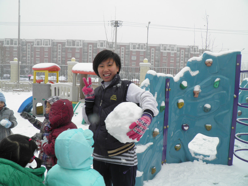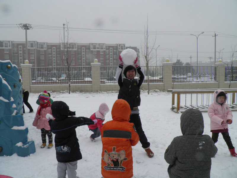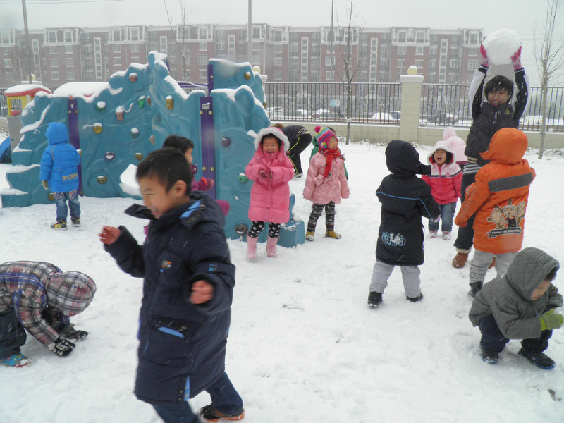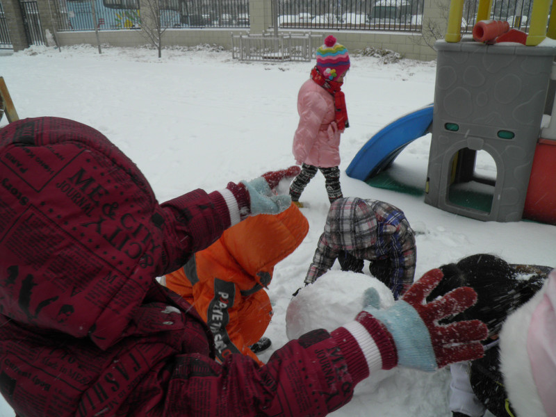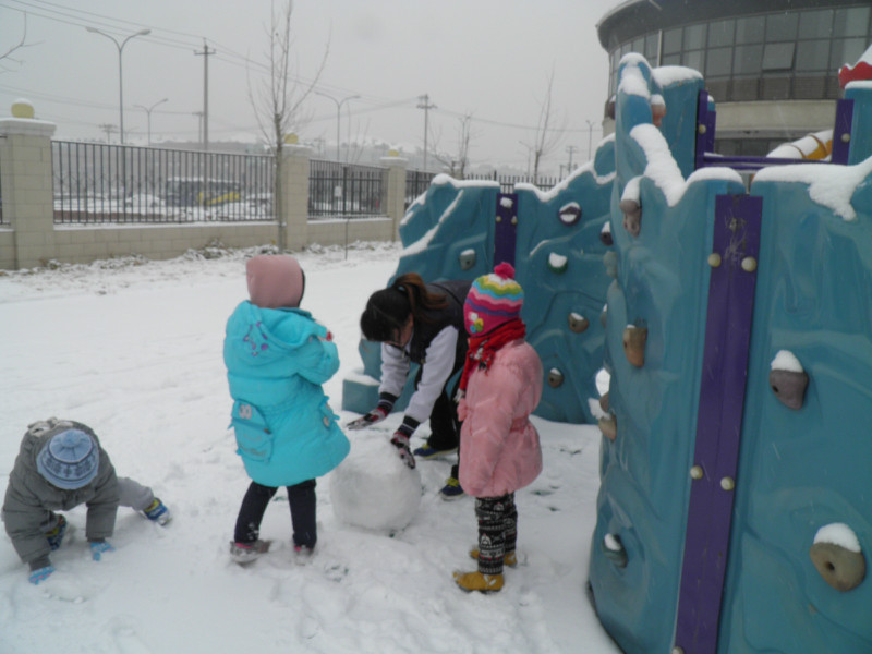 这些照片是在敬仪班的QQ相册里拷下来的,相册里放了好多照片,就拷下来几张有敬仪的。他们班前段时间建了个QQ群,每天都有家长们和老师聊天,班级主页里就不再放照片了。 前天晚上下了好大的雪,昨天上幼儿园小朋友们的户外活动就是在操场上玩雪堆雪人了。早上妈妈送敬仪上学时穿错鞋了,小家伙一路淌着雪到的幼儿园,小运动鞋全湿透了,袜子都湿了。姥姥九点半去幼儿园给她换了鞋和袜子,正好赶上小朋友们出去玩雪。老师给孩子们穿戴好,大家排队上操场。姥姥忘了给敬仪带手套了,小家伙就在一旁看同学们玩雪,照片上的敬仪都处于围观的状态!小甜心,没戴手套也可以玩雪的哦!以后妈妈每天早上送你上学都给你带上手套哈!! 这是他们的班主任李老师,非常有爱心、细心、耐心并且非常了解孩子们。老师滚了个大雪球堆雪人用。 ![]() 孩子们玩得好开心,刚才和敬仪看照片时,敬仪一一叫出了同学们的名字。 ![]() 雪人堆好啦 休了一个月零一周后,敬仪重新回到了幼儿园,已经上了一周学了。敬仪不再和以前一样那么兴奋了,不再每天回家说小朋友的名字,并且让我们模仿同学打电话了。也许是新鲜劲儿过了吧!!