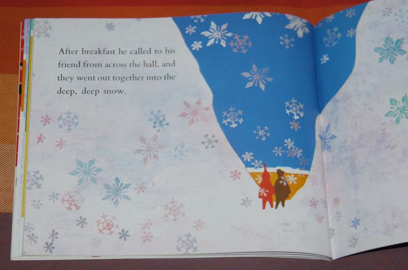 绘本The Snowy Day(《下雪天》)堪称经典,1969年获得凯迪克金奖,入选纽约公共图书馆“每个人都必须知道的100本图画书”。我给小荃读的是英文原版的,但之前我认真读过中文版的,不必受英文不通的折磨,讲起来顺畅,她听得也有趣。 冬日清晨,小男孩彼得醒来,看窗外都被白雪覆盖了。早餐后,他迫不及待的跑出门,路的两旁,雪堆得高高的,只空出一条可以走的路。嘎吱,嘎吱,嘎吱,彼得在雪地里留下了脚印,拖着脚在雪地上划线。接着,他又发现,树枝是个好东西,可以画线,也可以用来敲打树上的雪。 雪掉下来,正好掉在彼得头上,他像和大哥哥们打雪仗,又感到自己不够大。于是,他堆了一个雪人,又堆了一个天使,他假装爬到高高的雪山再一路滑到山脚……他做了大大的雪球放进口袋带回家,留着明天再玩。 在温暖的家里,妈妈帮彼得脱下湿袜子,他把雪地里发生的好玩的事情告诉了妈妈。临睡前,他发现口袋里空空的,雪球不见了,一下子好伤心。 梦里,太阳出来,雪全都融化了。不过,他一觉醒来,梦不见了,到处都是雪,新的雪还不停的下着。吃完早餐,他去找好朋友,他们一起跑进深深的雪地里。 皑皑白雪中,画面里的红、黄却显得很温暖。故事的内容,我想北方的孩子都会很熟悉,打雪仗、堆雪人,玩雪球,哪个小朋友不喜欢呢? 有些细节,比如用树枝划线、敲树上的雪,都是孩子们在雪地里常常做的事儿。就连回家后妈妈帮彼得脱湿袜子什么的,我们都不陌生——小荃同学星期六上午又去玩雪了,帽子围巾都不肯戴,在雪地里跑得小脸红扑扑,回家后也是一通洗脚换袜子。 书中文字简洁,英文如此,中文翻译过来也如此,却丝毫不影响内容的表达。简简单单的故事里,流露着小男孩彼得看到雪的欣喜、玩着雪的愉快,还有他把雪球装在口袋里的小天真、小创意。 下雪天,读读书,玩玩雪,多美啊! 本作品未经作者许可不得转载,转载请征求作者意见。擅自转载使用,将保留追究其法律责任的权利! |