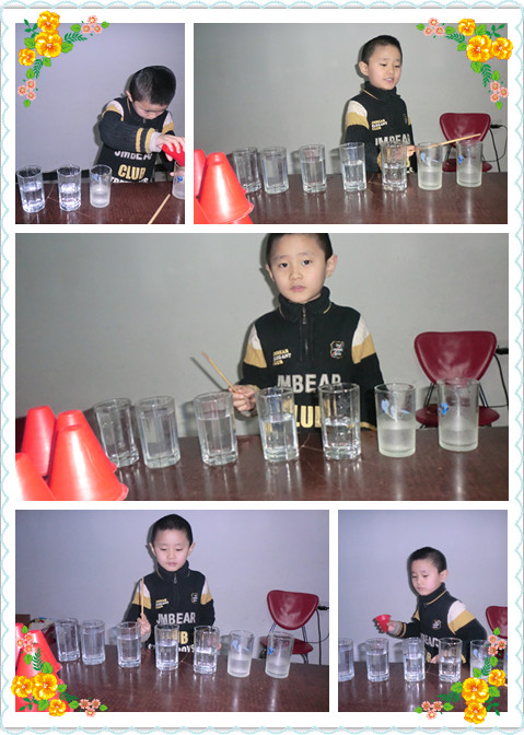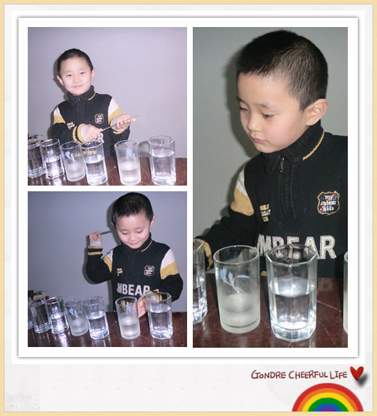 ![]() 阳阳一放学回来,写完作业就给妈妈唱歌谱,还真想回事儿,一直想让他学电子琴,人家就是不愿意学!记得3岁半的时候带他去,刚进人家那电子琴教室,就直接跑出来了,这就是他拒绝事物的最最直接的表现,既然他不愿意学,我也不强迫!后来我借来朋友的电子琴在家,准备自己没事的时候学学,给二宝做做胎教,呵呵,结果自己也没有耐心坚持!可是阳阳没事的时候就假装自己是个音乐家,把琴上面的音乐放着,假装弹琴似的,开始玩上一会儿! 学校开了电子琴的班级,阳阳也没有要求学,我就没有报,可是回来的时候,却能够给我唱上几句歌谱!今天放学回来,说要种水杯给我做一个敲钟! 找了7个水杯,再往里面倒入不同高度的水,把他们摆成一条直线!刚开始用竹子的筷子来敲,声音不清晰,不大!就换铁的筷子,哈哈,效果一下子就出来了! 来来来,仔细听听我用自己做的敲钟敲出来的音乐,好听吗? 玩够了水杯的敲钟,再来玩玩用轮滑的钉子做的金字塔,哈哈,不错吧!今天动手做的这俩都是这么的好玩,自己动手做的玩具,更加开发我们的大脑哦!好久没有给孩子添玩具了,内心不禁有些惭愧,觉得对不住孩子!看着孩子用家里的这些东西玩得不亦乐乎,我真的很高兴! 本作品未经作者许可不得转载,转载请征求作者意见。擅自转载使用,将保留追究其法律责任的权利! 评分记录