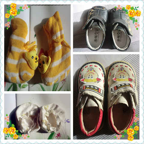 哈哈,两双皮鞋是朋友在她家找出来的宝贝小时候忘了穿,就小了的,感觉还新新的,等到宝贝学走路的时候,小脚丫应该能够穿上它们了!那小熊的毛线袜子鞋,是外婆带来的,还有那布做的婴儿鞋子,刚出生的时候穿的,呵呵也没有用上就小了!