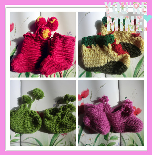 这些鞋子。呵呵,也不能称为鞋子,都是毛线织的,虽然有鞋子的样子,却和袜子差不多,小雨点儿也是没有穿几次,都小了,可能是孩子生在冬天,穿不上吧!不过那双黄色的,还是挺大,挺厚实的!春天就可以试试!