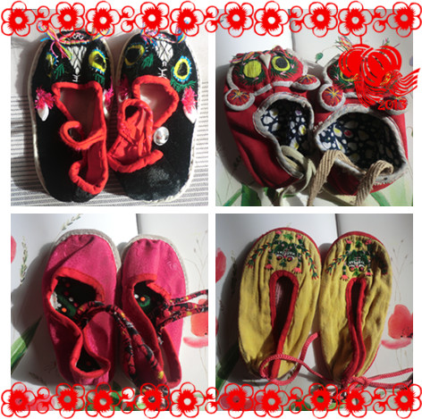 左上角的那双黑色的虎头鞋,还是新新的呢,很漂亮吧,都是纯手工绣的,本来想着今天给小雨点穿这双的,可是鞋子太大,一穿上,就掉下来了,所以就没有穿,右上角的那双是阳阳小时候穿的,看着挺漂亮,我一直留着!下面两双,就是别人给的,一看就是女孩子的鞋子,呵呵,不过等到小雨点儿学习走路的时候,这些鞋子也都穿不上了!