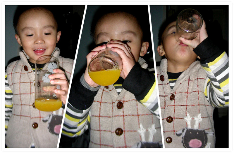 这是另外一边的橙子榨的橙汁, 这次小家伙可不是一饮而尽的,而是分了几次慢慢喝光的!!