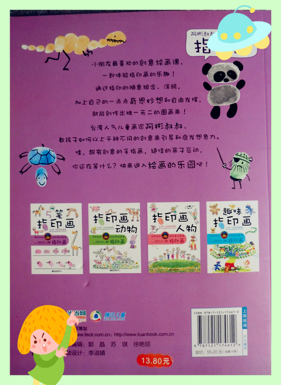 我们小时候画画只是局限于简单的描摹!知道有素描,水粉,国画,最简单的就是我们美术课上,老师画什么,我们就跟着画什么的照猫画虎的临摹!那个时候喜欢拿一个硬币放在一张白纸下面,用长长的铅笔在上面摩擦,白纸上就会出现一个硬币的模样,有些模糊,但是却给我们带来无限的快乐!对于指印画,我也是有了宝贝之后,才知道的!这次看到了《阿彬叔叔的指印画》自己都忍不住和孩子一起来画画了!现在的孩子为什么这么聪明啊,就是因为他们有了这么多的开发智力,让他们发挥无限想象的好书!感谢这些写好书的作者,出版好书的出版社,还有义务推广好书的育儿网站,让我们当妈妈的不要错过孩子的任何一个成长的,学习的,进步的机会!