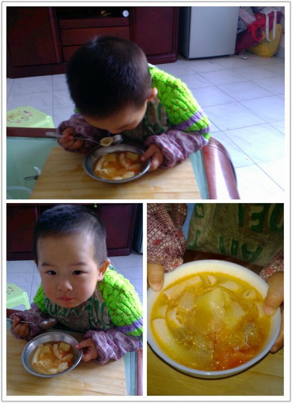 前几天小姑帮我买了些牛肉,我不知要怎么做,很少买牛肉,就是因为不会做。 炒的话我总是炒得太硬。而且她买得太多了,总不能全部都炒吧。 所以我今天想着做一个汤。 在网上搜了下牛肉汤,发现番茄土豆牛肉汤比较容易,而且正好我家里的材料都有。所以就试着做了。 我准备的的材料是:两个番茄,一个土豆,半个洋葱,一块牛肉。 首先我先将土豆去皮切块,然后拿盐水泡。 对于土豆,我总是很怕,因为以前听说土豆长芽了就会有毒。 所以我以前很长一段时间都不敢买土豆吃。 现在偶尔有买来吃,也不敢留太久。 还有每次都用盐水泡半个钟以上。 ![]() 接下来来分别将洋葱、牛肉都切得跟土豆差不多大块。 还有番茄也是切成这么大,但我先用开水烫过番茄,把皮去掉再切,这样好吃一点。 材料准备好后,就开始做了。 1、先将牛肉用冷水下锅,煮开煮出浮沫后,再将水倒掉,洗净牛肉放一边待用。 2、在炒锅里放油,先放洋葱炒香,再放番茄炒一会,再把牛肉和土豆放进锅里炒,然后加盐、糖和生抽调味。 3、加水进锅里,没过所有食材。水煮开后我把汤倒进电饭锅里,用煮粥的功能煮了几十分钟。 ![]() 因为之前炒的时候已经加了调味的,所以煮好后我觉得味道可以了,就不用再调味了。 然后我又煮了些通心粉和面条,加在汤里来吃,非常美味呀! ![]() 儿子吃通心粉,这个通心粉有几种形状,孩子很喜欢吃呢! 他一下子就吃了两碗呢!还说要装多一点。 本作品未经作者许可不得转载,转载请征求作者意见。擅自转载使用,将保留追究其法律责任的权利! 评分记录
