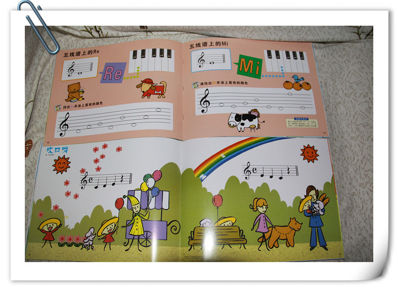 说完了上课,再来晒晒课本吧。一本课本、一本练习册、一张光盘,和上课时听的光盘一样。有时候还有作业,回家也需要听歌做作业巩固复习一下上次课的内容哈! ![]() 随手翻开课本,挑了几页拍照。 ![]() 据说上完这个课程,小朋友们都会弹一些简单的曲子、会简单作曲。这个课程是音乐课,不是弹琴课,培养的是音乐方面的综合素养与造诣。如果孩子对弹琴感兴趣,可以再接着学钢琴,那就是后话了,要是敬仪感兴趣,我们再学也不迟。 能让孩子快乐的兴趣班,虽然交通不太方便,虽然有一点远,但只要妈妈坚持,敬仪就能坚持!加油宝贝,让我们继续开开心心沉浸在音乐的海洋里,得到快乐!