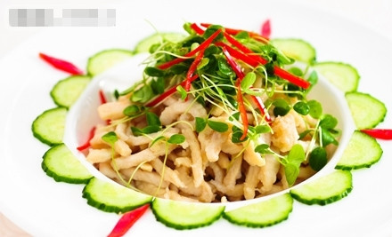 看菜单还不错,价格也便宜,实物怎么样呢?因为是唯一的一桌客人,菜很快就上来了。最先上来的是凉菜-----香椿拌鸡丝。除了是凉的以外,味道还真不错。而且所有菜都不辣,非常适合孩子吃。