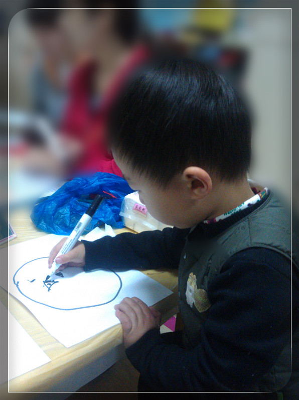 然后老师给出一张纸和一支笔,让孩子看着镜子里的自己,画出自己的脸蛋,点点先画了自己的脸型,圆圆的,三角形的眼睛,还是一大一小,真是搞笑了,还在眼睛上画上眼睫毛,很细致的呢。接着画了三角形的鼻子,还有两个点,是鼻孔哦。最后画上方形的嘴巴和两只耳朵,我说点点的嘴巴是椭圆形的,可是人家就是想要方形的,那就这样吧,一个小脑袋画好了。 画的很认真呢,一笔一划都不要妈妈指导,我说了点点一句,他就说:“这是画的我自己,不是妈妈。”说得对,自己画自己能画错吗?