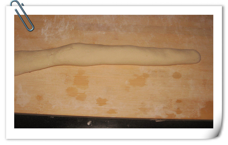3、搅拌和面,中间软了加了两次面,继续和面。 4、然后用盆扣着面一会儿。 5、把面揉成长条,切成一个一个的。