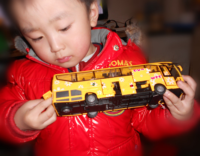 过新年,除了给孩子准备衣服什么的,我可早就给孩子准备了新的玩具。这可是我提前在淘宝上败好2个,就在过年时才给他的,让他有个意外的惊喜,呵呵。一个是怀旧款的火车玩具,一个是5开门的大巴士,都是合金的,做工都很精致,也很耐摔的,毕竟现在孩子的破坏力是超强呀 先来看这款怀新的合金火车 东风火车头 这可是罐罐最喜欢的火车玩具 这款怀旧的东风7246火车头 ,而且还是声光版的回力模型,价格是33 这款火车长19.6厘米 车门可以打开的 底部有12个轮子 轻轻一按火车,火车就有声音的,而且顶部的灯光也会亮的 整体的做工比较精致 难怪罐罐一看见这个火车模型,马上就很激动的说他坐过这个火车的,而且他的口头语就是‘我坐过的,还要坐’。哈哈 这款巴士汽车也是合金的,5开门的,前后车门,行李箱,后面的发动机舱都可以打开 而且按压车子的后面,车子的里面就要亮灯光,也是有音乐的 这款的价格是55 颜色是黄色的,图案是小蜜蜂的,全长尺寸是22.5 来张近影的特写 前面车子打开 清楚的看见有个司机坐在里面的 很逼真的 看看罐罐很好奇呢 马上就在把所有的车门都打开了 玩得是不亦乐乎呢