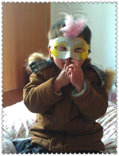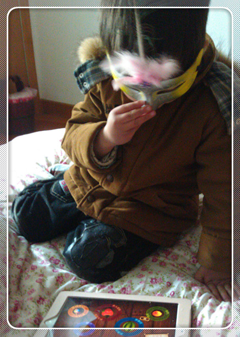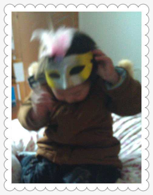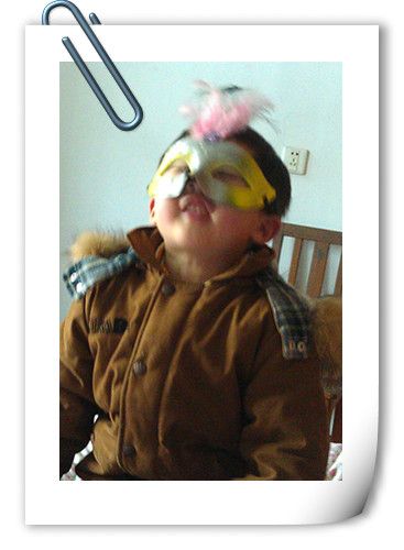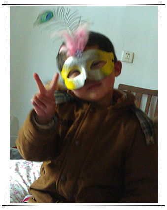 回来后,点点就拿着自己的羽毛面具开始显摆了,带着面具,阿姨说他是佐罗,点点就问什么是佐罗,然后阿姨就告诉点点是一个戴着面具的英雄人物,这下点点起劲了,就说自己是佐罗,还“耶!”呢。戴着面具不肯脱下来,一边看IPAD一边说自己是佐罗。这个面具有点大,老是会掉下来,然后戴了一会儿,点点就拿下来了。让点点把面具借给大姐姐戴一下,点点还不愿意哦,把面具藏起来了,真是一个小气鬼哦。