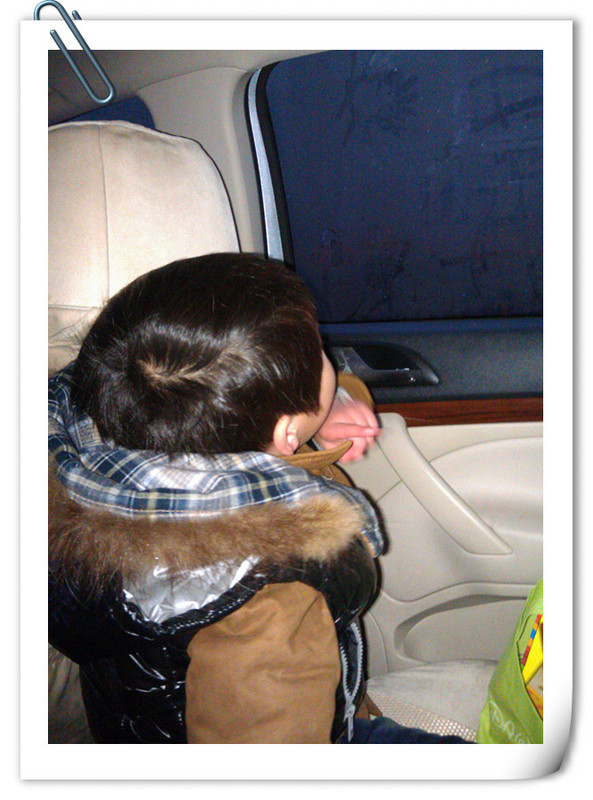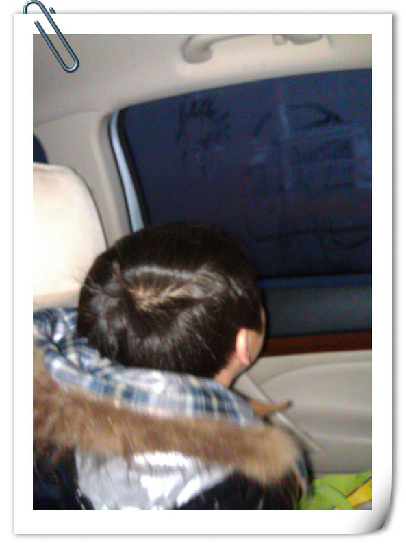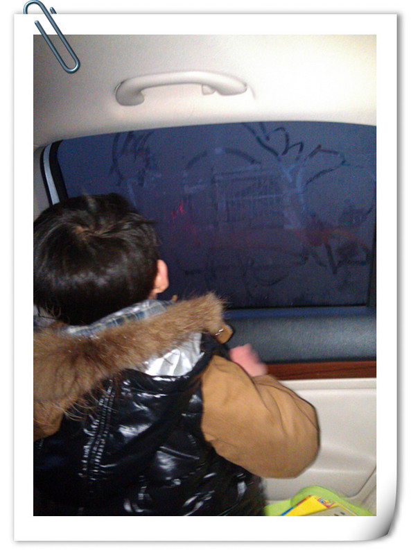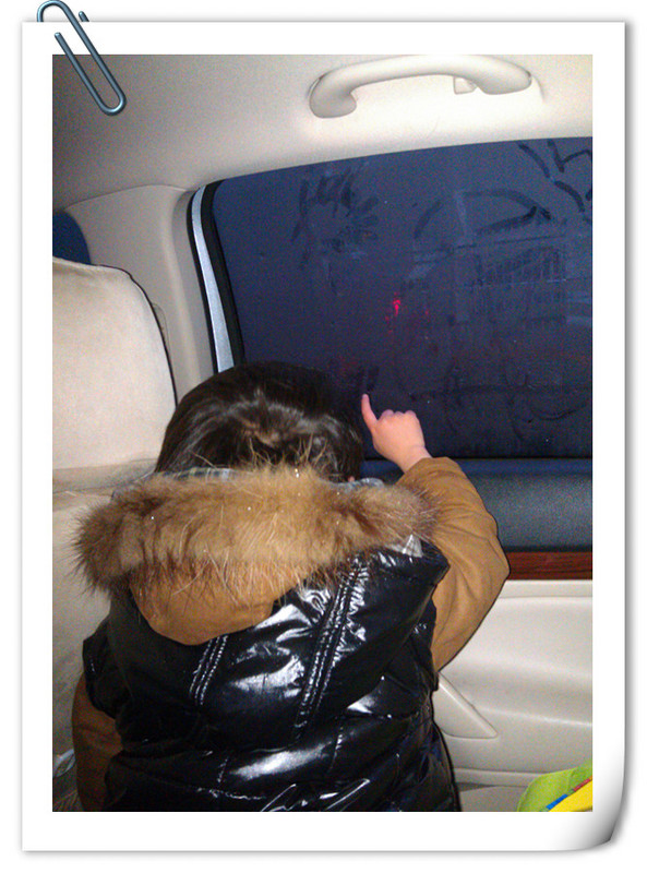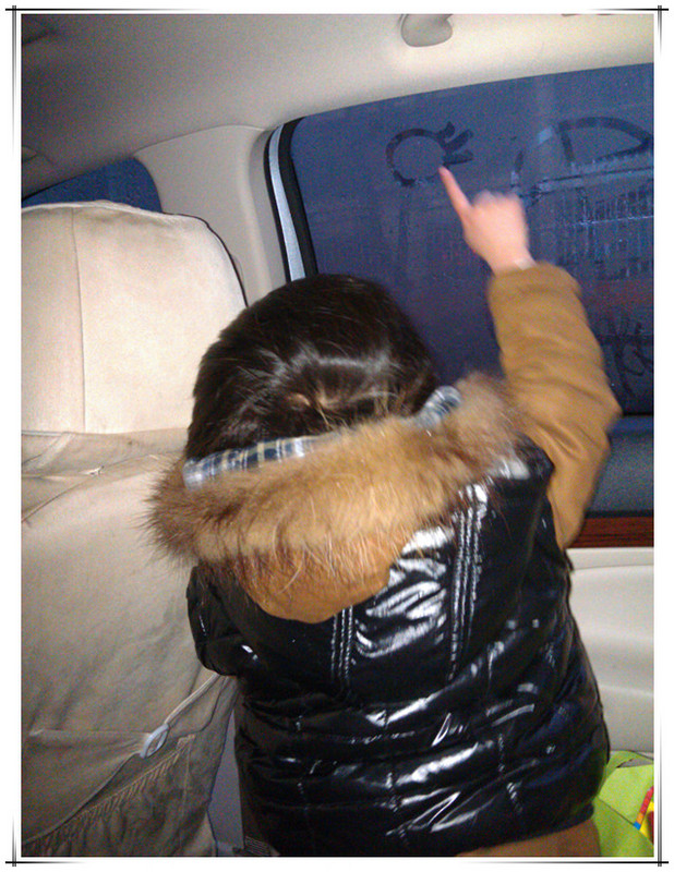 玩了一会儿,点点站在后面的座位上,伸手到车窗上去摸一下,想看看外面的雪下得怎么样的了,可是看不清楚,点点就对我说:“妈妈,车窗上雾蒙蒙的,看不清楚外面了。”我说:“是的,我们车内的温度高,外面温度低,所以车窗上形成雾气了。”然后点点说:“刚才我在车窗上摸了一下,好像写字一样,我来画画了。”