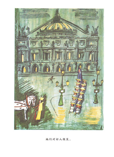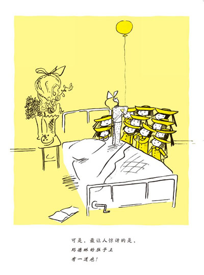 内容简介 《玛德琳》一共是四十四幅图,其中八幅是彩色的,余下的三十六幅则是黄底黑白画面。彩色的除了一张病房的花之外,都是巴黎的街景以及戏剧性的场面,用电影语言来说就是远景,如第9页,孩子们穿过旺多姆广场时,遇到一个捂着帽子紧追珠宝盗贼的警察。第24页救护车驶过有埃菲尔铁塔耸立的街道。而黄色背景的黑白画面,多半是房子里面发生的事,如孩子们刷牙、睡觉。 顺便说一句,《玛德琳》还有一个诱人之处,就是画出了巴黎的风景。中文版和日文版后面都有一个附录,一一标出哪一页画出了那些巴黎有?的场景,像巴黎圣母院、卢浮宫、卢森堡公 园等等。