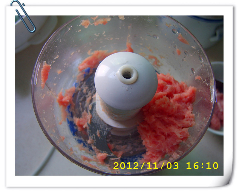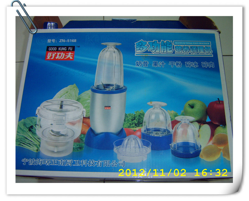 2、2010年跟着姐姐一起买的多功能营养调理机。 每次买肉回来,我都用刀把肉剁碎,然后再放在锅里面加些酱油水蒸给莹配粥,有时也会用剁碎的肉加在蛋里面蒸鸡蛋羹给莹吃,加了瘦肉的蛋蒸好后汤头更甜哦。那天莹爸提醒我说N年前我不是买了一个调理机,也可以绞肉的,干吗不拿出来用呢?莹爸说我老是乱买东西老是放着不用。哈哈,拿出来亮相喽,原来是好功夫牌的多功能营养调理机。2010年的一个星期六我去姐姐家的时候,看到姐姐买的这个调理机,功能还挺多的,姐姐还用来绞肉,还自己包着水饺吃呢。姐姐还说可以做豆浆吃,还可以做果汁喝。说得我挺心动的,姐姐就带着我去那经销店买了一个回来。
