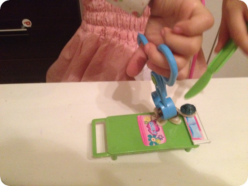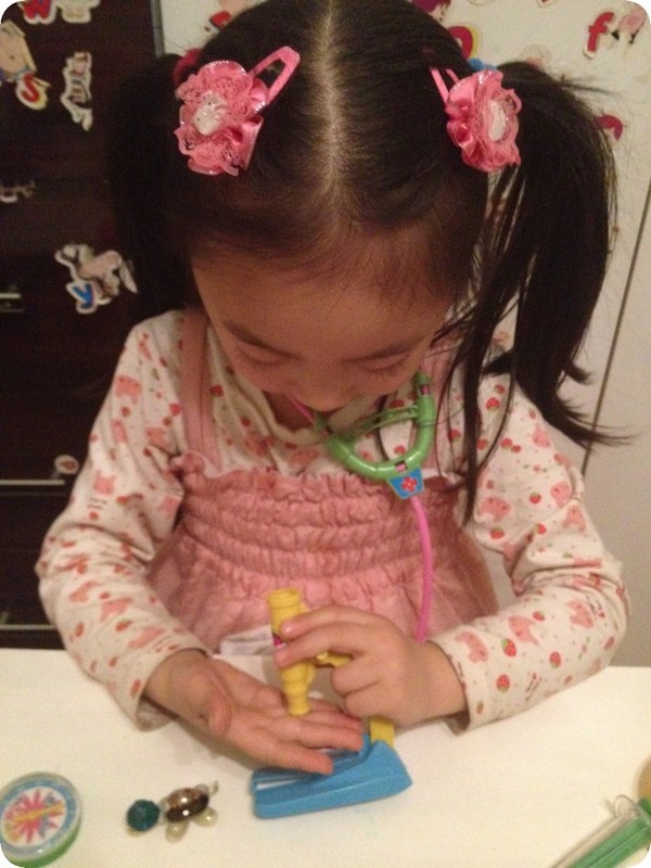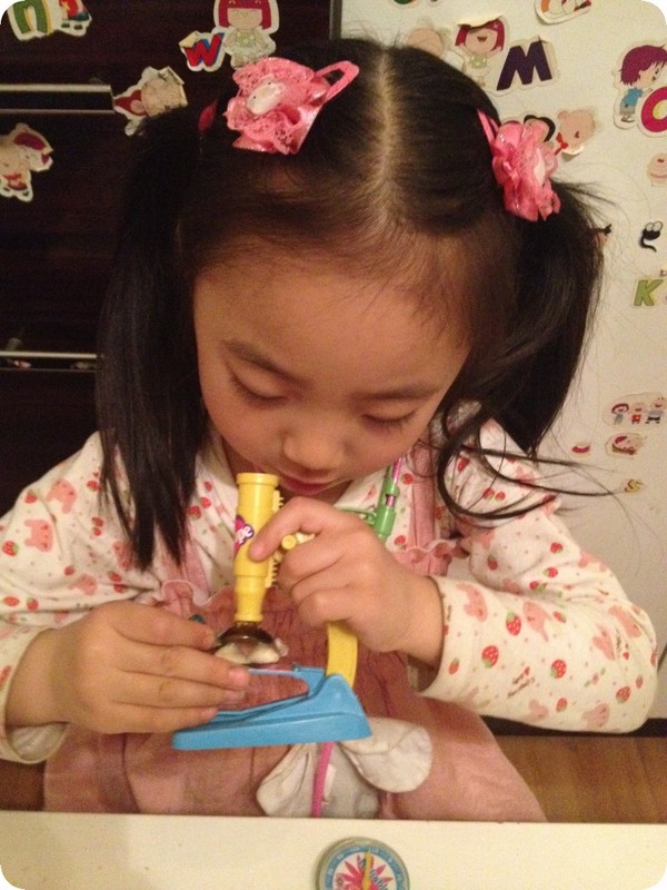 这套玩具虽然挺便宜的,但做的还算精致,物件也挺多的,贝贝这一晚上一直在玩,除了时不时的骚扰我们一下,让我们扮演病人,更让我觉得搞笑好玩的是,小家伙找了一个巨听话的病患——小乌龟!所有的医疗器械都让小乌龟尝试了一遍,哈哈,颇有点小医生的风范呢!不过,看她拿着小乌龟玩,实在是可爱至极,忍不住拍了这些照片。