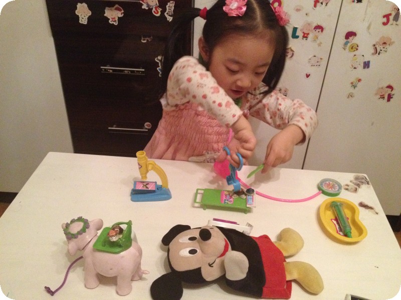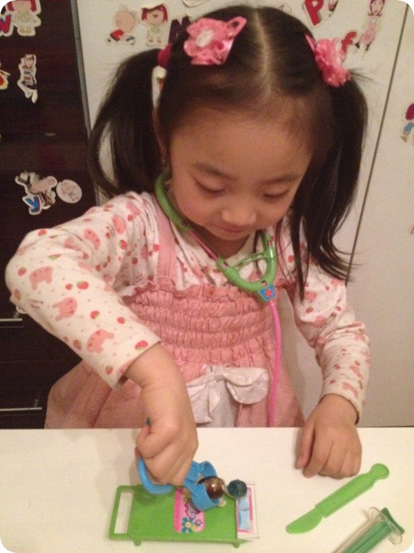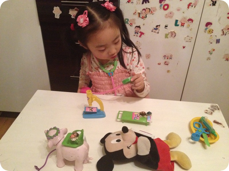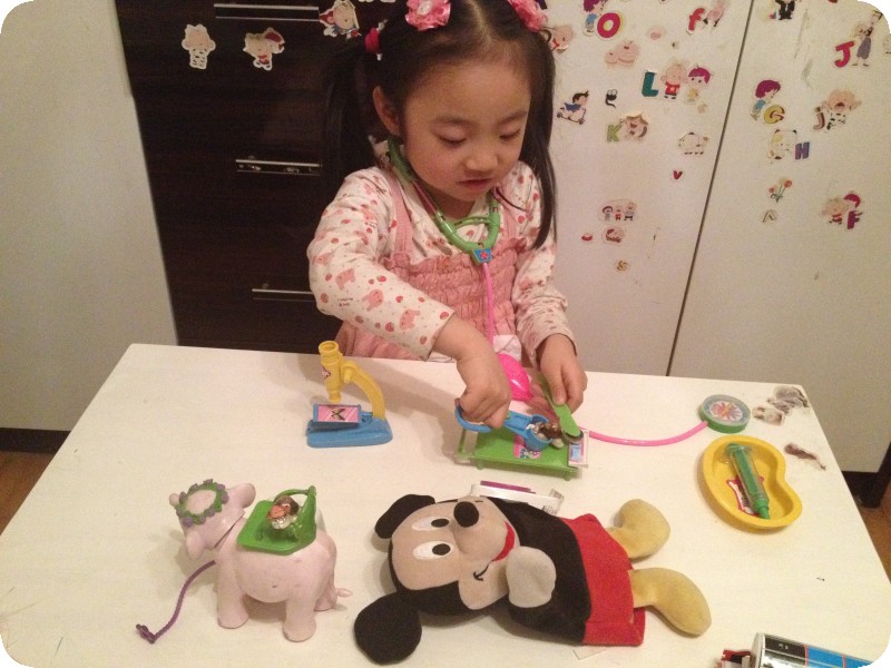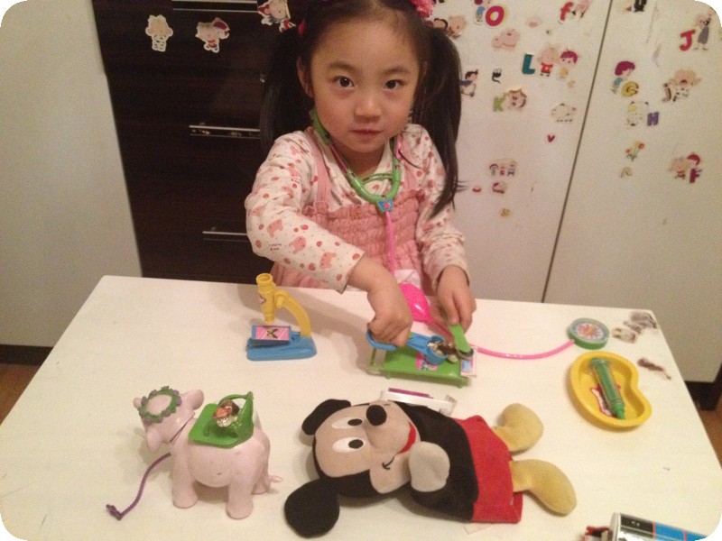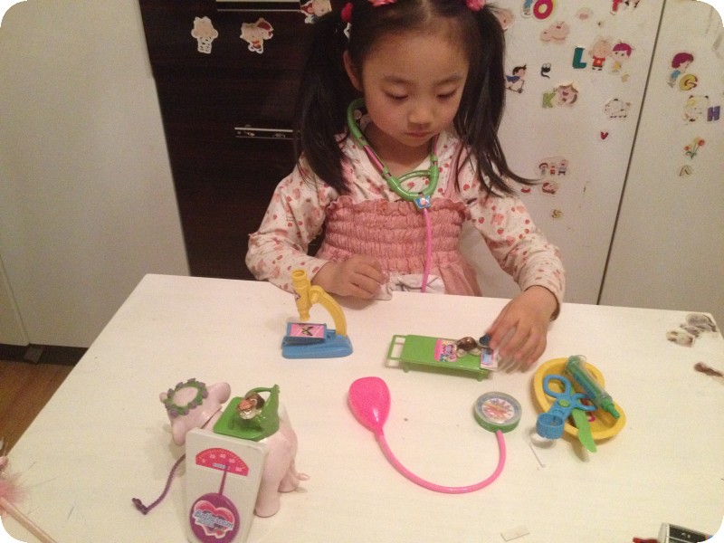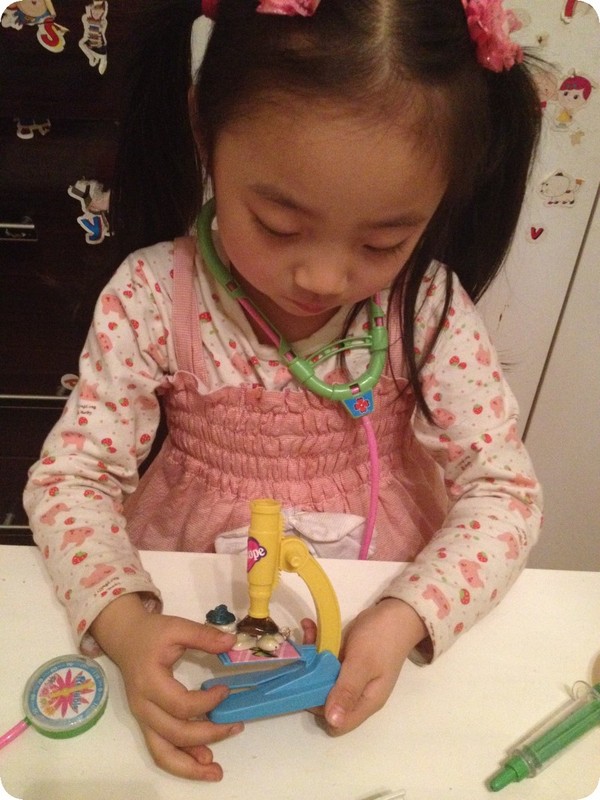 前几天下班回来,贝贝特别兴奋的让我看她的东西——一套医生玩具。其实以前给她买过一套医生玩具,时间久了,乱扔乱放,找不到几件了,几次央求我再给她买一套,都没答应。现在拥有了,能不在我面前得瑟一下嘛。奶奶说,接她放学出来,小家伙跟奶奶说“去卖玩具的那看看,我不买。”瞧瞧,人家说的多好,只是看看,又不买,能不让去看看吗,我接的时候她也经常这样,一般不给买,看看就走了。这次也一样,看了一会走了,但是呢,一边走一边自己嘀咕“那个医生玩具很好呀,我都想要了,我可真想要呀。。。。。。”奶奶一听,受不了啦,得,孩子都这么说了,那就买吧,返回去给小家伙买了,成功让奶奶心甘情愿掏腰包!!