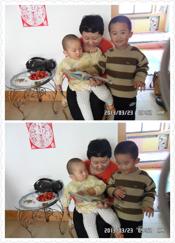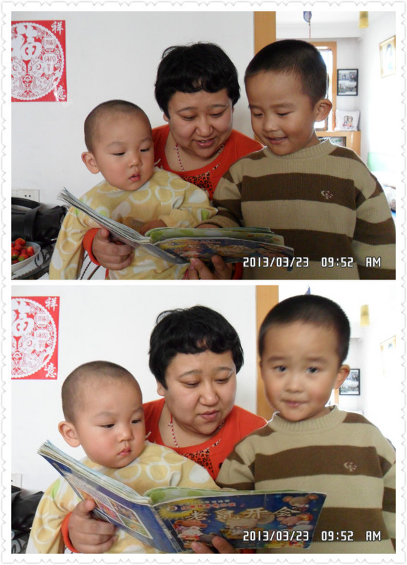 ![]() 因为姥姥生日的缘故,姥姥家来了好多的人,大家都是来祝贺姥姥生日的。这样,林林和他的小哥哥乐乐又重逢了。想着去年十月一姥爷过生日的时候,小哥俩非常的不和谐,乐乐那时不大懂事,啥玩具也不给林林玩,弄的林林老是哭。这次好了,可有大哥哥样了,在一起很开心。 ![]() ![]() 一开始林林看到哥哥的时候,非常的陌生,本来自己在那玩的很好,这会也不玩了,光是看着哥哥。小外甥现在特别的淘气,没事就爱做鬼脸,儿子看他好像有点害怕。这不我带了本林林平时看的故事书,乐乐给发现了,当时妹妹正抱着林林,我说让小姨给你俩讲故事吧! ![]() ![]() 两个小家伙才凑一起了,他们的小姨就给他俩开始讲故事了,讲的是《老鼠开会》的故事,这是林林最爱听的故事,所以林林听的非常认真,乐乐边听边偷瞄相机的镜头,还是大的有心眼,知道我给他们照相呢!我们不在一个城市,所以两个小家伙平时根本没有机会在一起接触,难得能在一起玩呢! ![]() 看看乐乐多有镜头感啊,还在做鬼脸呢!林林发现了哥哥的变化,把目光投向了哥哥,估计在想哥哥那是在干什么呢?