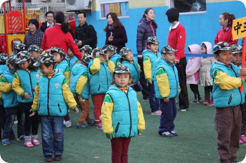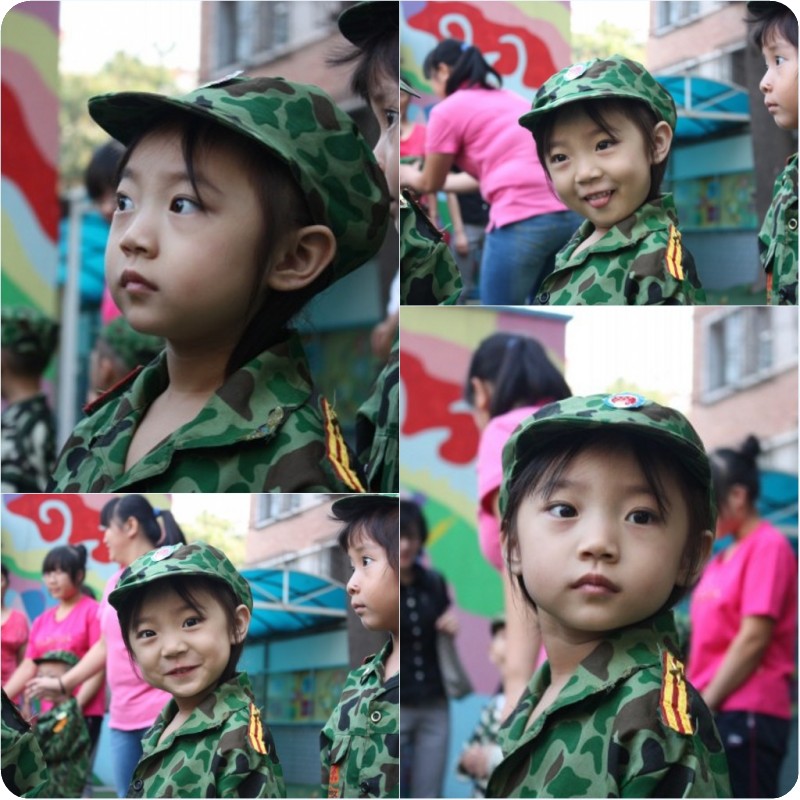 哈哈,看看这张照片,是不是稚嫩了很多,这是2011年9月,贝贝刚满三岁,升入小班参加幼儿园的第一次升旗仪式,不过那时纯粹是打酱油的,跟在大班小朋友的后面,不过迷彩服穿起来很帅呀!!