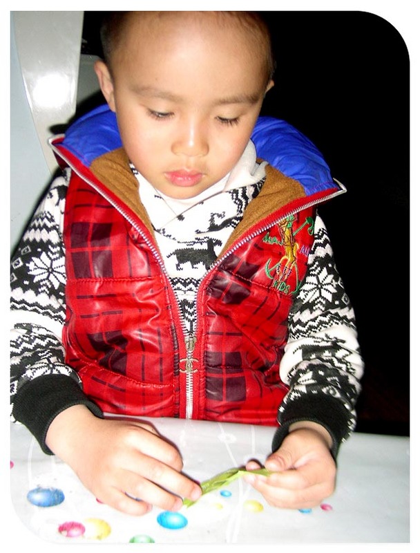 谦谦又被这一串的蝴蝶吸引了, 练习之前先让孩子充分的喜欢,并且有尝试的意愿,这是妈妈的目的