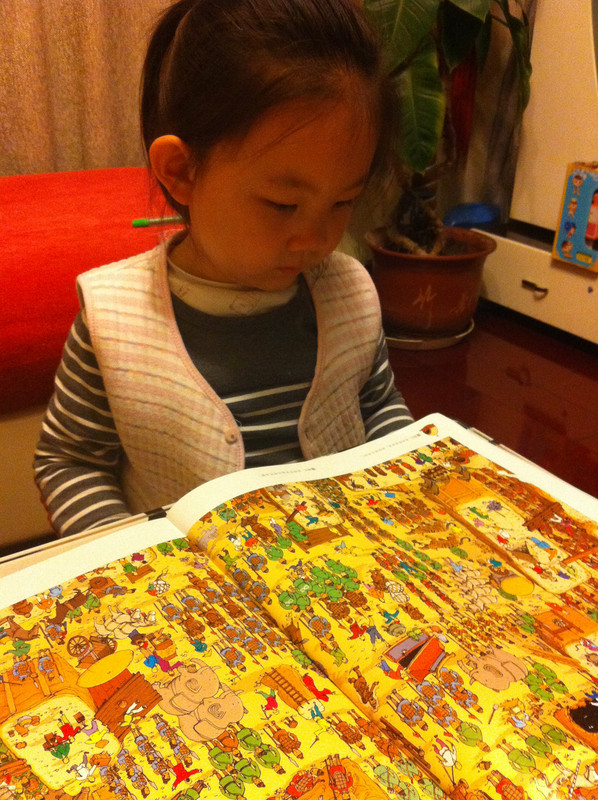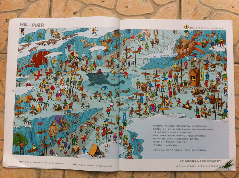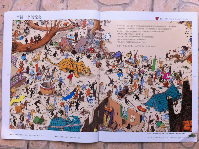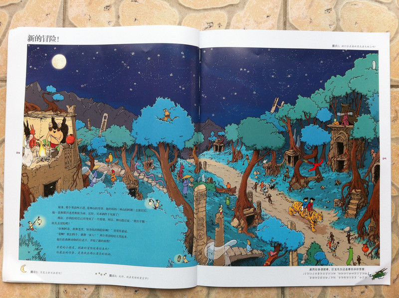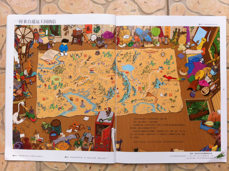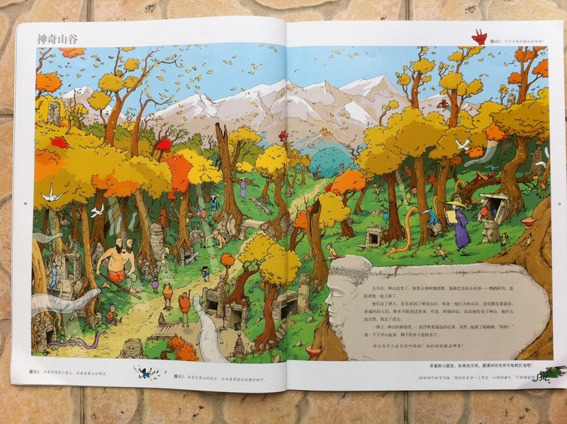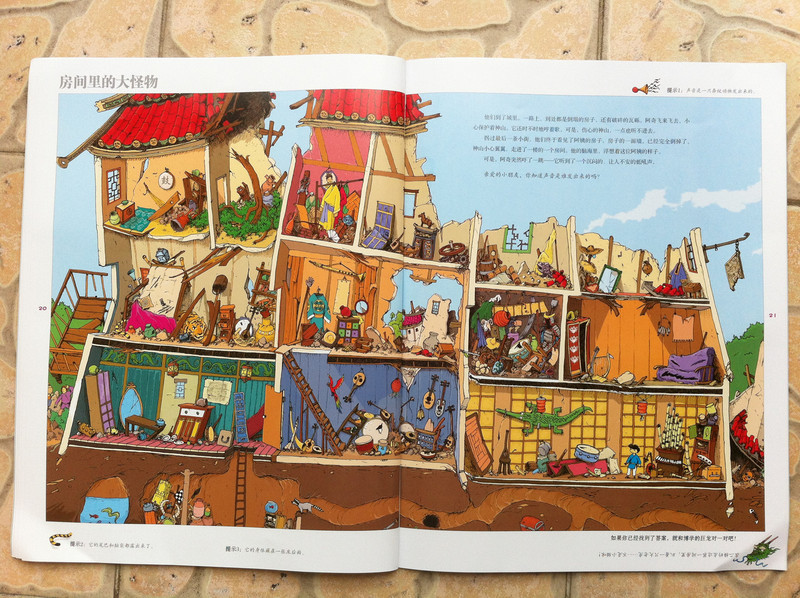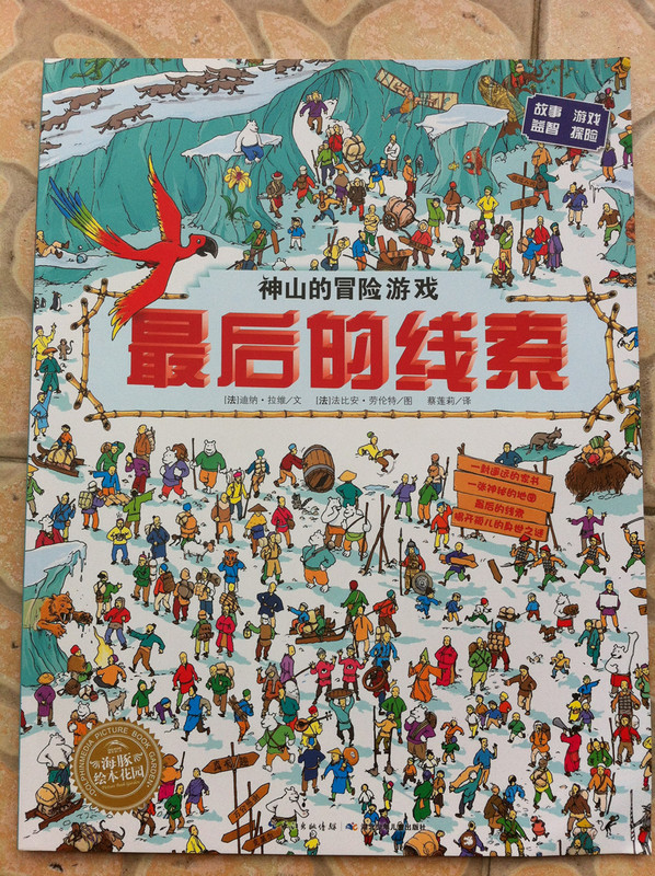 而我今天所读的故事书,所配的图,真切的带着我和孩子,一起去冒险,一起的身临其境。 家中的宝贝,是个胆小的孩子,自认为她是个绝对的和平者。不管是书,还是电视,都见不得有半点,她所认为可怕的事情。打仗的书,图形可怕的书,孩子都不敢看,一般都会放在一边,引领着,都不肯读。而今天看到书,妈妈我认为,还是很有意思的。希望孩子喜欢。 什么是冒险呢?就是经过很多磨难,很多困难,很多意想不到的经历。而我今天和孩子一起读的这本《最后的线索》一书,就有着这样的感觉。故事中,有着中国的传统文化氛围,并且每经过地方,都会让孩子有身临其境的感觉,并且还有多样化的细节内容,激发想象力,提高观察力,建立孩子通过全局发现细小,相对于胆心的孩子来说,就是一次体验冒险的旅程。 那么我们一起来读故事吧。 有一个神山的小朋友,是个孤儿,生活在绿树成荫的小镇上。某一天飞来一只送信的小鸟,他在小镇的上空寻找神山。因为人太多了小鸟的眼睛都花了。 然后故事开始提问了,让小朋友们帮着寻找神山和信鸟。美妞一下子就看了一个背着包袱的白色大鸟。就用笔给画出来。神山在哪里呢。小神山真的很小,在这么多人群里,找真是锻炼孩子眼睛。 我想书中为了不让小朋友失望和找不到,每页呢,都有提示,这样我们就跟着提示,就找到了答案。 鸟儿找到了神山,并且把信递给了神山,因为路程太远了,信都有些破了。知道鸟是从哪里飞来的吗,是从沙里拉哈吧飞来的。通过信,神山知道自己并不是孤儿,还有一个阿姨。 然后提问了,说小朋友知道花了多少时间,鸟才把信送来的?这个问题,对于美妞来说有点难,不过我们可以引导一下。我让美妞找这封信所在,然后看看信上有没有时间,然后给孩子粗略的讲一下,信的概念。然后在让美妞看地图,让她用小手,来描一下,从神山住的地方去阿姨那里有多远。美妞告诉,是从最左边到最右边,一定很远。 几天后,神山带着他的鹦鹉出发去寻找阿姨,要和阿姨团聚。首先来到神奇山谷,这个山谷,到处充满着诡异。神山有些害怕了。但是神山一直想着遥远的往事,突然神山看见了妈妈。 问题就是找到妈妈?美妞不怎么喜欢这幅图,觉得有些害怕,人有两个头,还有长长的东西。不过一下子找到了,妈妈的脸,是用树叶拼成的,很是漂亮。 不知不觉神山来到了双胞胎村,这里的人,都是双胞胎。当神山和鹦鹉想问问路时,大家都不知道路,最后告诉他,找到双胞胎村唯一一个单胞胎小蓝林,小蓝林知道路。 小蓝林在那里?读这个故事,美妞喜欢先找到神山,再去找故事所问。故事中的穿蓝色衣服的人很多,可是美妞一下就找到了神山。小蓝林呢,按照提示,也可以一下子找到。这幅图,很中国,武士是美妞最喜欢的,因为他跟现在的警察不一样。 小蓝林很奇怪,说的话也很奇怪,说离这很远地方,有一只用泥土烧制的军队,哪有一个地理学家,找到地理学家,他手里有一本指南,上面说的清清楚楚。神山和鹦鹉,听得糊里糊涂的安装小蓝林说的,就去找。 那么你能找到地理学家吗?美妞找了半天都没有找到。最后我帮忙了。 拿到地理学家的指南,神山和鹦鹉继续上路。他们走了很久来到一座高高的山。沿着雪山往上爬。冷得他们直打哆嗦。最糟糕的是,鹦鹉的五彩羽毛,也慢慢变淡了,变成一只白色鹦鹉了。神山感叹着,想把鹦鹉留下,可是鹦鹉说什么都要配着神山。这时,鹦鹉感觉到有一个危险的家伙看着他们。 你知道是什么吗?美妞根据提示找到了。看到一颗书后面是一只白色的狼。美妞害怕了。问我,妈妈狼会吃人吗,会吃掉神山吗?故事有点意思了。 神山吓得一阵小跑,离开的雪山。这让鹦鹉好点。神山想起小时候,每次生病妈妈都给他唱歌。于是他就抱着鹦鹉开始唱歌。而鹦鹉好像中了魔法一样,又变回五彩鹦鹉了。但是发现到了一个到处都有路标的地方。 那么帮着神山找路标吧。正确的。美妞认字,倒是很快找到了,缓解了刚才那一页的紧张。 好不容易弄清方向,继续上路。来到了白熊的领地,这里,都是白熊。白熊首领说,你会魔法,你一唱歌,就可以让白色鹦鹉,变得五彩缤纷的,那么你也施魔法吧,让我们也变得五彩缤纷。你不唱我们就吃掉你。神山只好唱起歌来。但是,过了很久,白熊们也没有什么变化。 提问了,为什么神山没有被吃掉呢。美妞又开始有点紧张了。我连忙引导美妞,神山没有被吃掉,想想为什么呢,是不是歌唱的太好听了。这样一说,美妞点点头说,妈妈,肯定是神山的歌,太好听了,大家都入迷了,所就神山就趁此时跑了。呵呵,不错。理解不错。 逃出白熊部落,神山和鹦鹉来到了沙里拉哈吧国。可是当到这里时,这里一片废墟。神山很惊讶,他连忙找到一个过路的商人问。并打听阿姨的地址。那个商人告诉神山,红色屋顶的就是你阿姨家,可是今年地震时,她已经去世了。神山脸一下白了。决定还是去看看。 问题是,怎么才能走到阿姨家呢。找到一条安全的路。探险到现在,美妞的表情,很沮丧了。因为美妞是个绝对和平者。虽然美妞一下子就找到了房子,但是美妞却问我,妈妈咱们这里会发生地震吗,也会这样吗? 神山进到城里到处都是坍塌的房子,和破碎的瓦片。神山和伤心,虽然鹦鹉不断安慰着他。最后他们来到阿姨的房子前,可是他们却下了一跳,他们听到一个沉闷让人不安的吼声。 提问,是谁发出来呢?我按照提示