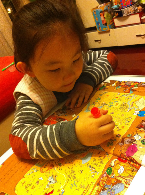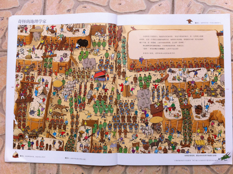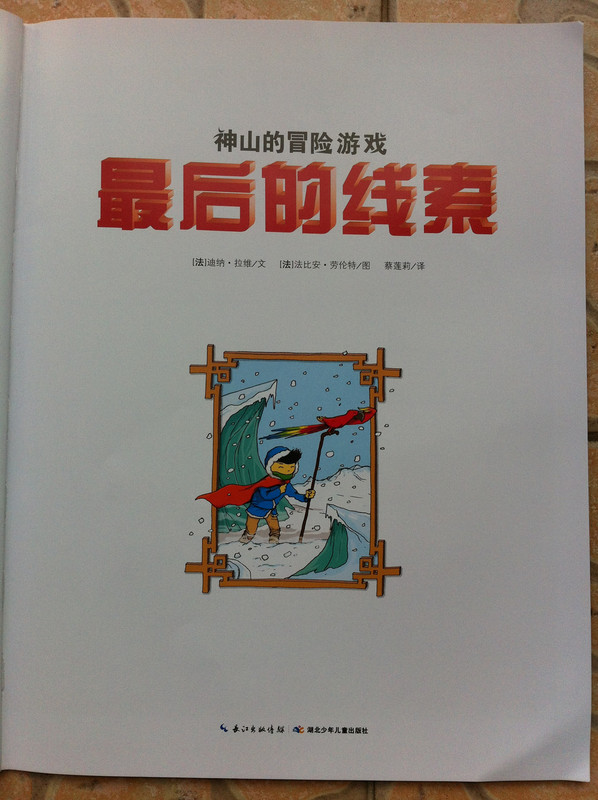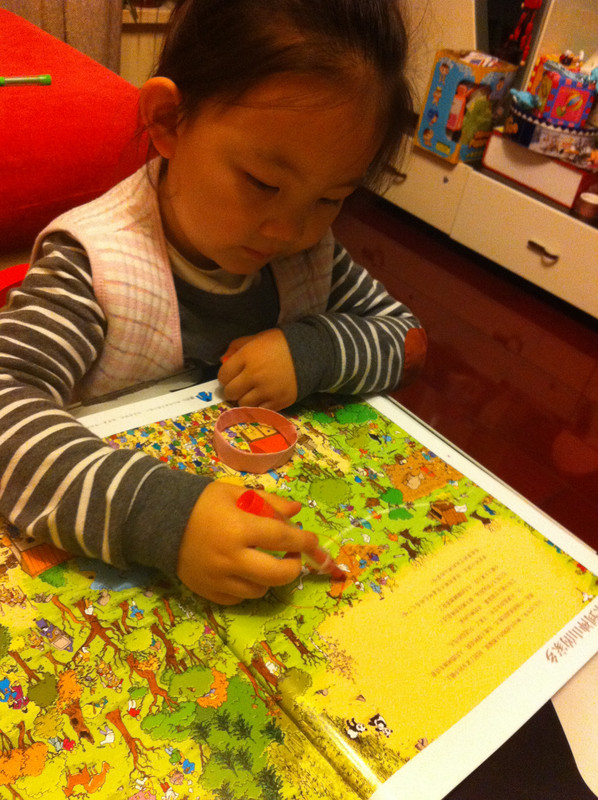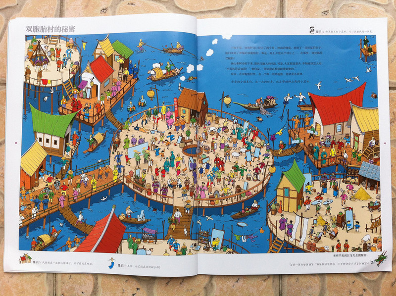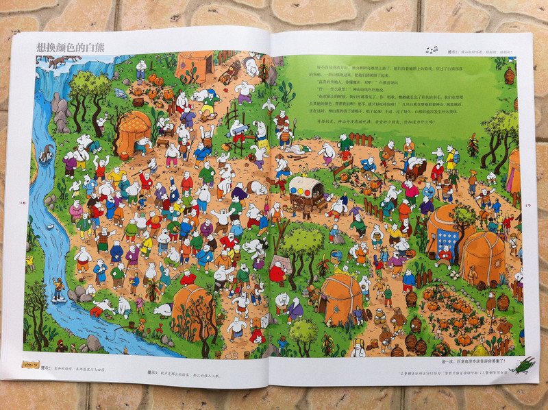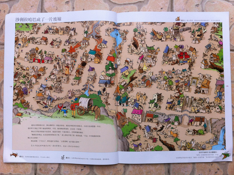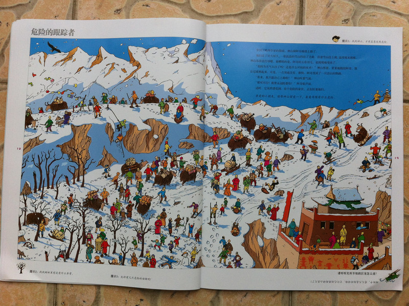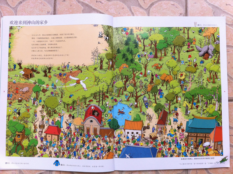 而我今天所读的故事书,所配的图,真切的带着我和孩子,一起去冒险,一起的身临其境。 家中的宝贝,是个胆小的孩子,自认为她是个绝对的和平者。不管是书,还是电视,都见不得有半点,她所认为可怕的事情。打仗的书,图形可怕的书,孩子都不敢看,一般都会放在一边,引领着,都不肯读。而今天看到书,妈妈我认为,还是很有意思的。希望孩子喜欢。 什么是冒险呢?就是经过很多磨难,很多困难,很多意想不到的经历。而我今天和孩子一起读的这本《最后的线索》一书,就有着这样的感觉。故事中,有着中国的传统文化氛围,并且每经过地方,都会让孩子有身临其境的感觉,并且还有多样化的细节内容,激发想象力,提高观察力,建立孩子通过全局发现细小,相对于胆心的孩子来说,就是一次体验冒险的旅程。 那么我们一起来读故事吧。 有一个神山的小朋友,是个孤儿,生活在绿树成荫的小镇上。某一天飞来一只送信的小鸟,他在小镇的上空寻找神山。因为人太多了小鸟的眼睛都花了。 然后故事开始提问了,让小朋友们帮着寻找神山和信鸟。美妞一下子就看了一个背着包袱的白色大鸟。就用笔给画出来。神山在哪里呢。小神山真的很小,在这么多人群里,找真是锻炼孩子眼睛。 我想书中为了不让小朋友失望和找不到,每页呢,都有提示,这样我们就跟着提示,就找到了答案。 鸟儿找到了神山,并且把信递给了神山,因为路程太远了,信都有些破了。知道鸟是从哪里飞来的吗,是从沙里拉哈吧飞来的。通过信,神山知道自己并不是孤儿,还有一个阿姨。 然后提问了,说小朋友知道花了多少时间,鸟才把信送来的?这个问题,对于美妞来说有点难,不过我们可以引导一下。我让美妞找这封信所在,然后看看信上有没有时间,然后给孩子粗略的讲一下,信的概念。然后在让美妞看地图,让她用小手,来描一下,从神山住的地方去阿姨那里有多远。美妞告诉,是从最左边到最右边,一定很远。 几天后,神山带着他的鹦鹉出发去寻找阿姨,要和阿姨团聚。首先来到神奇山谷,这个山谷,到处充满着诡异。神山有些害怕了。但是神山一直想着遥远的往事,突然神山看见了妈妈。 问题就是找到妈妈?美妞不怎么喜欢这幅图,觉得有些害怕,人有两个头,还有长长的东西。不过一下子找到了,妈妈的脸,是用树叶拼成的,很是漂亮。 不知不觉神山来到了双胞胎村,这里的人,都是双胞胎。当神山和鹦鹉想问问路时,大家都不知道路,最后告诉他,找到双胞胎村唯一一个单胞胎小蓝林,小蓝林知道路。 小蓝林在那里?读这个故事,美妞喜欢先找到神山,再去找故事所问。故事中的穿蓝色衣服的人很多,可是美妞一下就找到了神山。小蓝林呢,按照提示,也可以一下子找到。这幅图,很中国,武士是美妞最喜欢的,因为他跟现在的警察不一样。 小蓝林很奇怪,说的话也很奇怪,说离这很远地方,有一只用泥土烧制的军队,哪有一个地理学家,找到地理学家,他手里有一本指南,上面说的清清楚楚。神山和鹦鹉,听得糊里糊涂的安装小蓝林说的,就去找。 那么你能找到地理学家吗?美妞找了半天都没有找到。最后我帮忙了。 拿到地理学家的指南,神山和鹦鹉继续上路。他们走了很久来到一座高高的山。沿着雪山往上爬。冷得他们直打哆嗦。最糟糕的是,鹦鹉的五彩羽毛,也慢慢变淡了,变成一只白色鹦鹉了。神山感叹着,想把鹦鹉留下,可是鹦鹉说什么都要配着神山。这时,鹦鹉感觉到有一个危险的家伙看着他们。 你知道是什么吗?美妞根据提示找到了。看到一颗书后面是一只白色的狼。美妞害怕了。问我,妈妈狼会吃人吗,会吃掉神山吗?故事有点意思了。 神山吓得一阵小跑,离开的雪山。这让鹦鹉好点。神山想起小时候,每次生病妈妈都给他唱歌。于是他就抱着鹦鹉开始唱歌。而鹦鹉好像中了魔法一样,又变回五彩鹦鹉了。但是发现到了一个到处都有路标的地方。 那么帮着神山找路标吧。正确的。美妞认字,倒是很快找到了,缓解了刚才那一页的紧张。 好不容易弄清方向,继续上路。来到了白熊的领地,这里,都是白熊。白熊首领说,你会魔法,你一唱歌,就可以让白色鹦鹉,变得五彩缤纷的,那么你也施魔法吧,让我们也变得五彩缤纷。你不唱我们就吃掉你。神山只好唱起歌来。但是,过了很久,白熊们也没有什么变化。 提问了,为什么神山没有被吃掉呢。美妞又开始有点紧张了。我连忙引导美妞,神山没有被吃掉,想想为什么呢,是不是歌唱的太好听了。这样一说,美妞点点头说,妈妈,肯定是神山的歌,太好听了,大家都入迷了,所就神山就趁此时跑了。呵呵,不错。理解不错。 逃出白熊部落,神山和鹦鹉来到了沙里拉哈吧国。可是当到这里时,这里一片废墟。神山很惊讶,他连忙找到一个过路的商人问。并打听阿姨的地址。那个商人告诉神山,红色屋顶的就是你阿姨家,可是今年地震时,她已经去世了。神山脸一下白了。决定还是去看看。 问题是,怎么才能走到阿姨家呢。找到一条安全的路。探险到现在,美妞的表情,很沮丧了。因为美妞是个绝对和平者。虽然美妞一下子就找到了房子,但是美妞却问我,妈妈咱们这里会发生地震吗,也会这样吗? 神山进到城里到处都是坍塌的房子,和破碎的瓦片。神山和伤心,虽然鹦鹉不断安慰着他。最后他们来到阿姨的房子前,可是他们却下了一跳,他们听到一个沉闷让人不安的吼声。 提问,是谁发出来呢?我按照提示