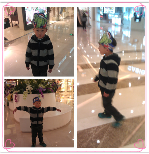 一天在万达玩的时候,经过迪博乐园,正好看见工作人员在发迪博乐园里面的小动物的头饰,点点嘴巴甜,多叫了几声阿姨,就给了点点两个头饰,一个是小恐龙迪博,还有一个是小象艾利。 点点拿了小象的头饰,就扣好了网头上戴着了,点点说:“妈妈,这是我的皇冠。”我说:“这只是头饰而已。”点点说:“我在学校里面用雪花片做的王子皇冠就是这样的,还可以戴在头上,就是不能带回家。”我问点点:“学校里还做了皇冠啊,做得怎么样?”点点说:“做的很好,还得了小红花,我做了两个皇冠,得了两个小红花。”我就夸点点真棒。点点戴着所谓的皇冠让我给他拍照,点点摆了各种姿势给我拍照,看起来很喜欢这样的头饰。