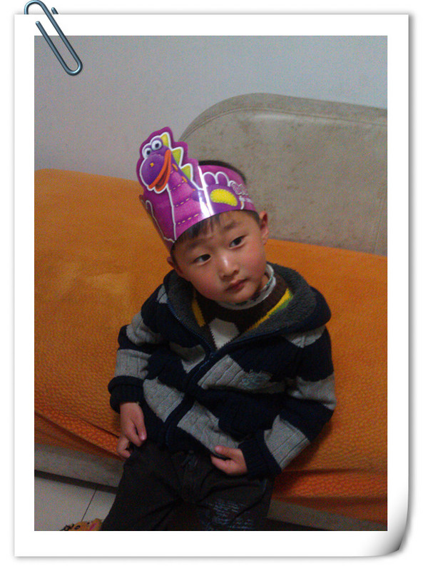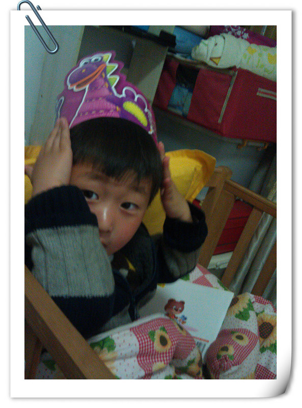回到家,点点又开始研究另一个头饰,是小恐龙迪博,点点做好以后就戴在头上,就说:“妈妈,我现在是dinosaur,go……”然后问我:“你害怕吗?”我说:“你是可爱的恐龙,我不害怕。”点点就戴着头饰看书,洗脚,下棋,睡在小床上还戴着这个小恐龙的头饰,直到睡觉才拿下来。