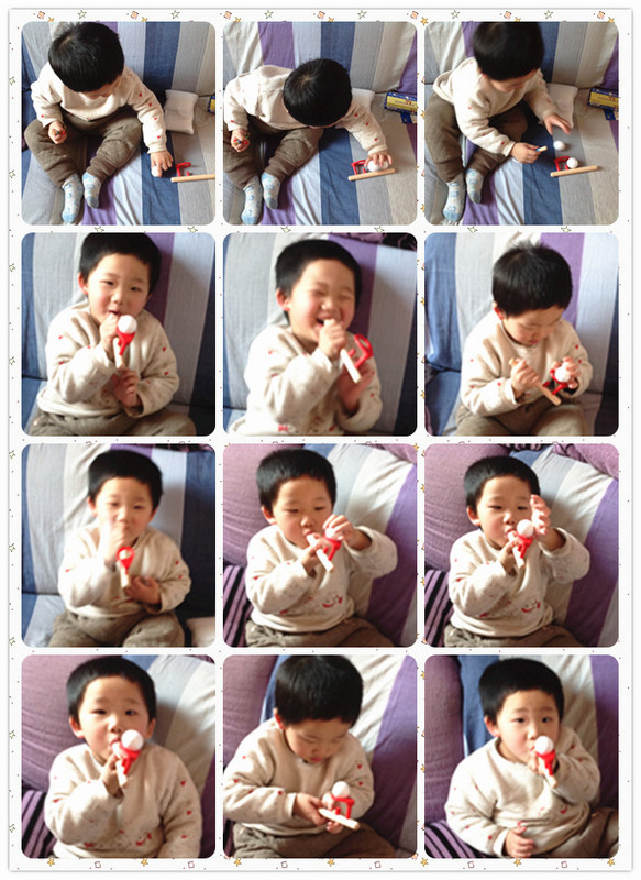 小逗看见我吹就乐的嘎嘎笑~~自己一边吹一边乐~~那两个小球球他也超级喜爱~~ 本来还怕他吹不起来呢~没想到很容易吹呢~~ 哎~~大霍霍啊~~~玩一会儿就不好好玩了,拿到地下敲,给把放球球的那个小木板给敲下来了~~ 好让我修修~~我可咋修啊???
